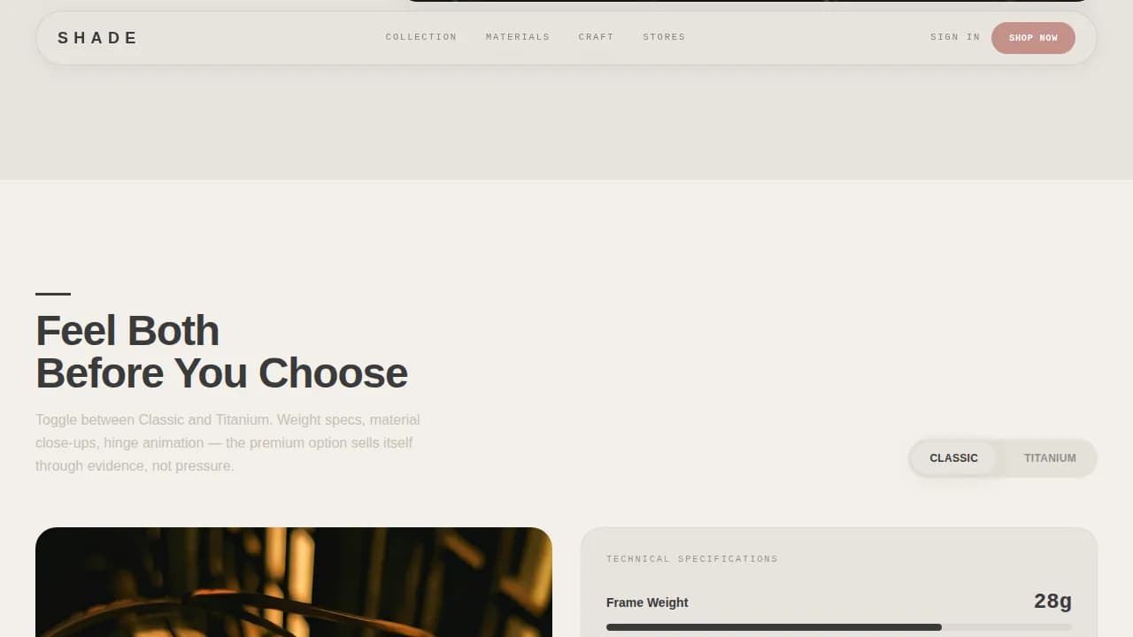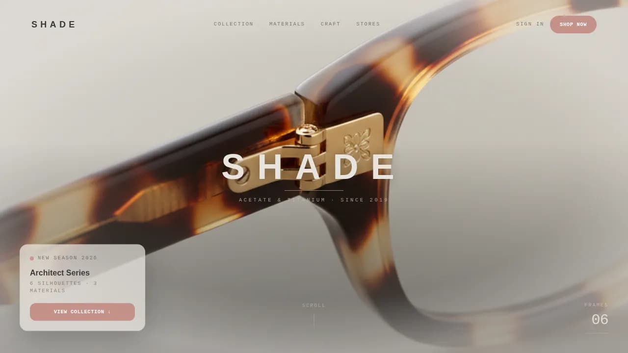 Shade is a gallery-style landing page built for an architectural eyewear brand. It pairs a Bold Brutalist design sensibility with a Soft Mist color system to let the product take center stage. The page guides visitors through a curated frame collection, an interactive material toggle, and a clear titanium upgrade path, all rendered in raw concrete aesthetics and sharp graphic detail.
