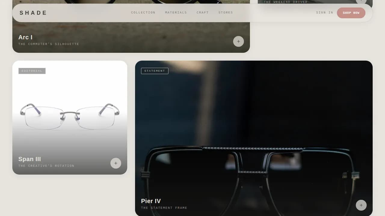Most product pages treat eyewear like inventory. Items stack in a grid, filters shrink the experience, and the design competes with what it is supposed to showcase. Shade solves this by giving each frame room to exist on its own terms.