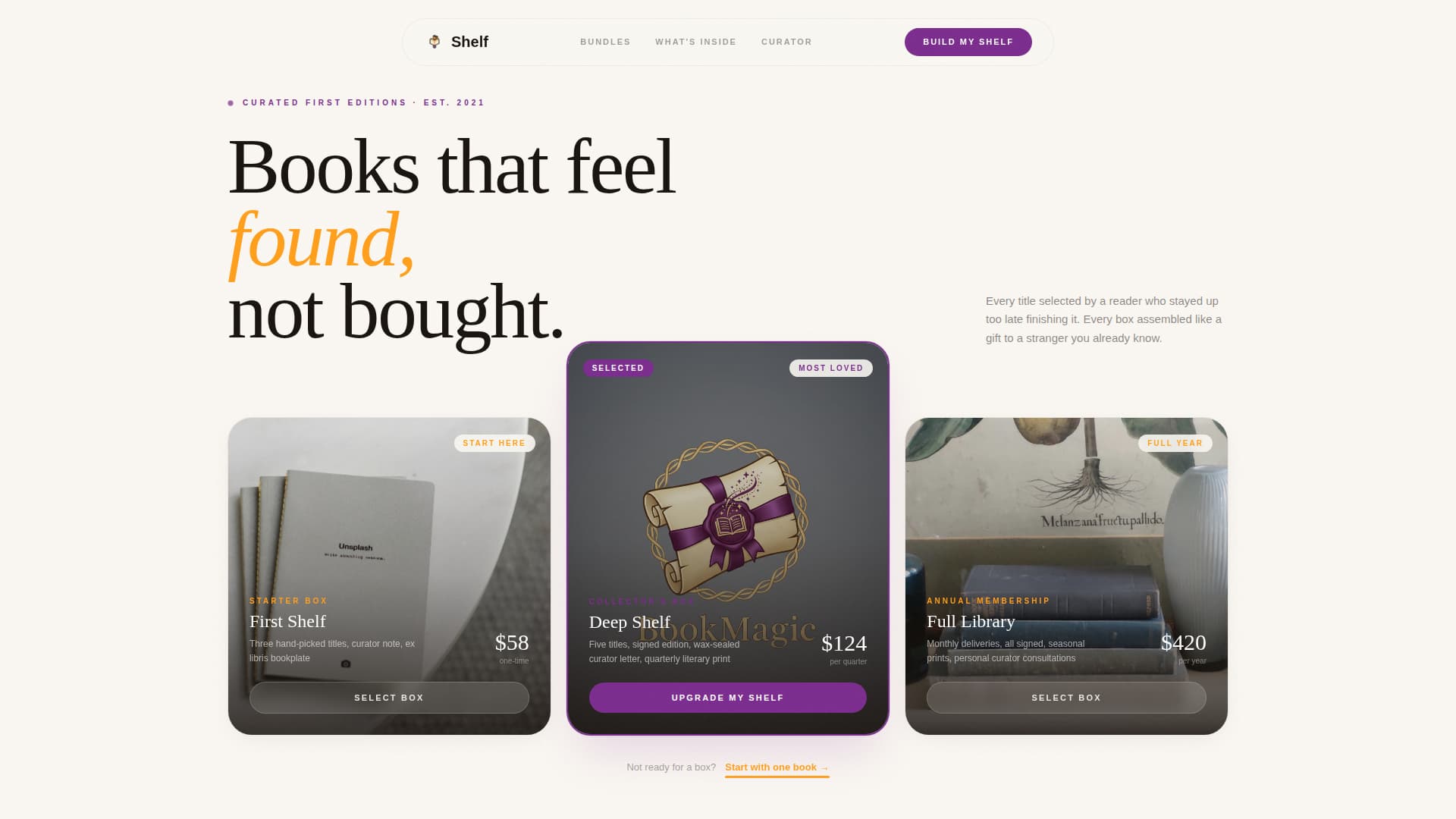 Shelf is a bento grid landing page built for boutique bookstores that sell hand-picked first editions and curated subscription boxes. It guides design-conscious visitors from browsing to buying through three tiered bundle offers, an interactive Before/After reveal, and a taste profiler that captures emails and reading preferences for follow-up conversion.