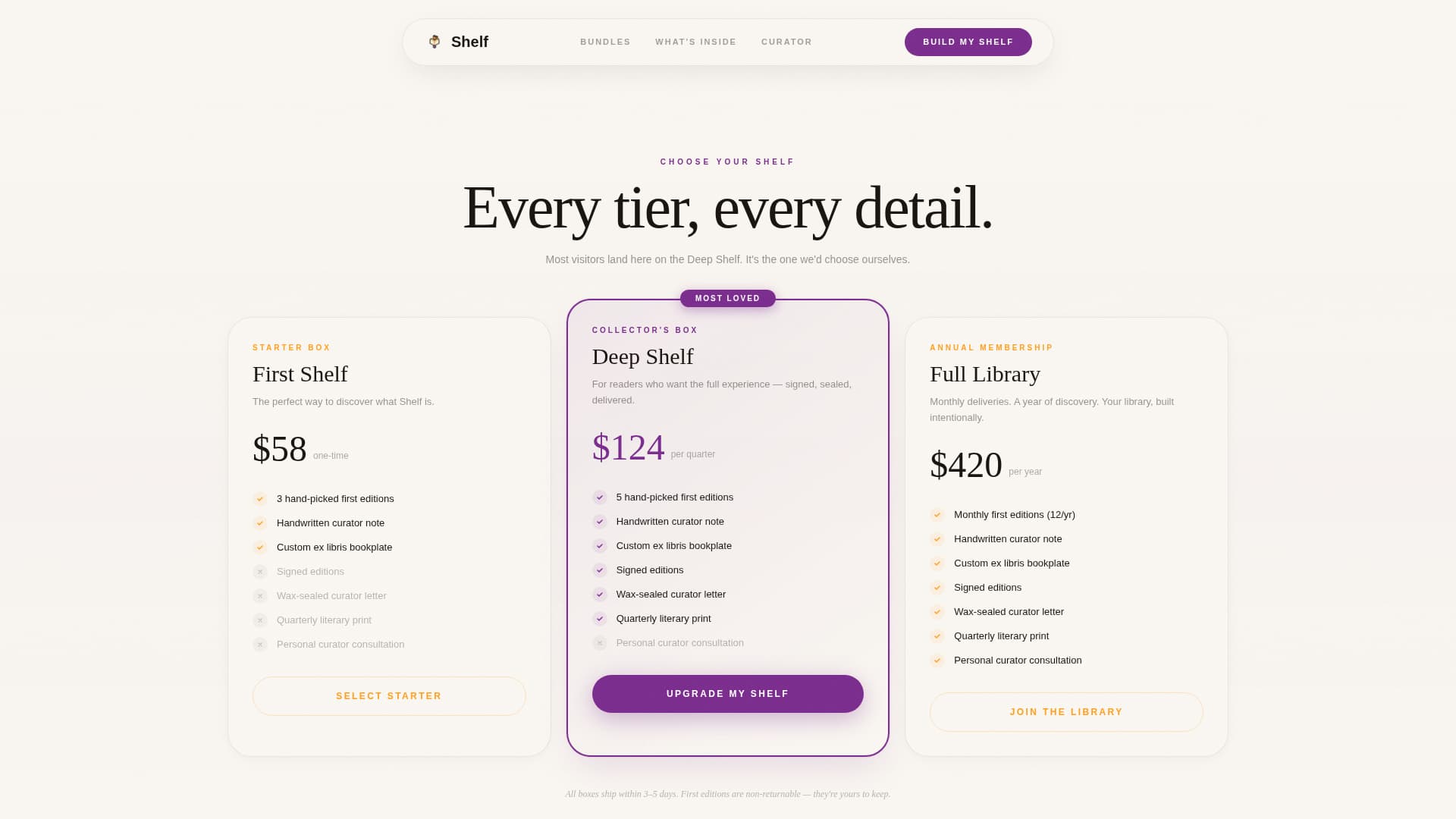 The tier comparison section lands visitors on the mid-tier "Deep Shelf" box by default. A violet "Upgrade My Shelf" call-to-action button sits at the visual intersection of all three tiers. A comparison row lists exactly what each tier adds, including personalized curator notes, signed editions, and quarterly literary prints.