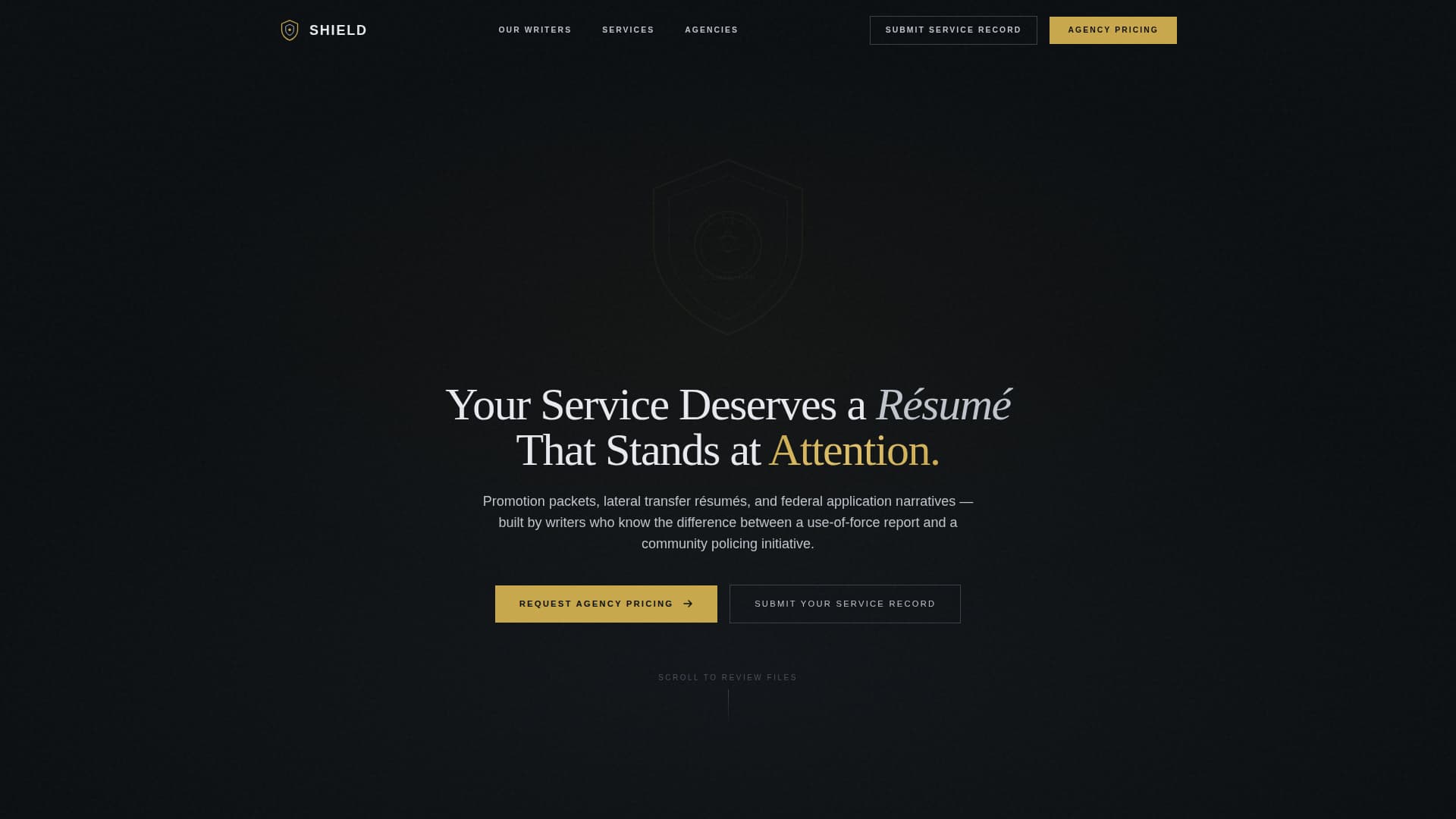 Shield is a storybook landing page template designed for professional résumé services targeting law enforcement personnel. It opens with a four-second SVG badge assembly animation, moves through three credentialed writer spotlights, and closes with a B2B agency pricing form. The dark immersive design signals institutional authority from the first scroll to the last.