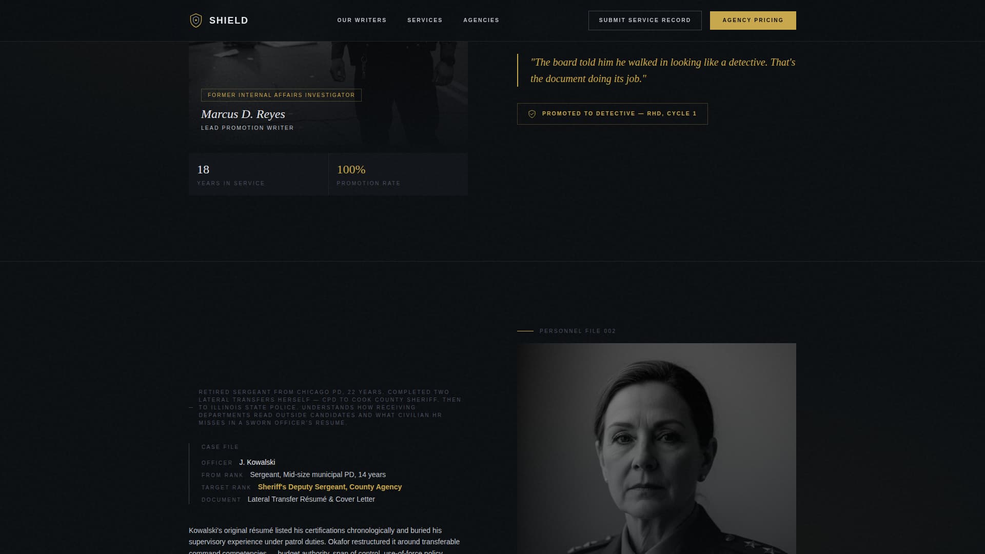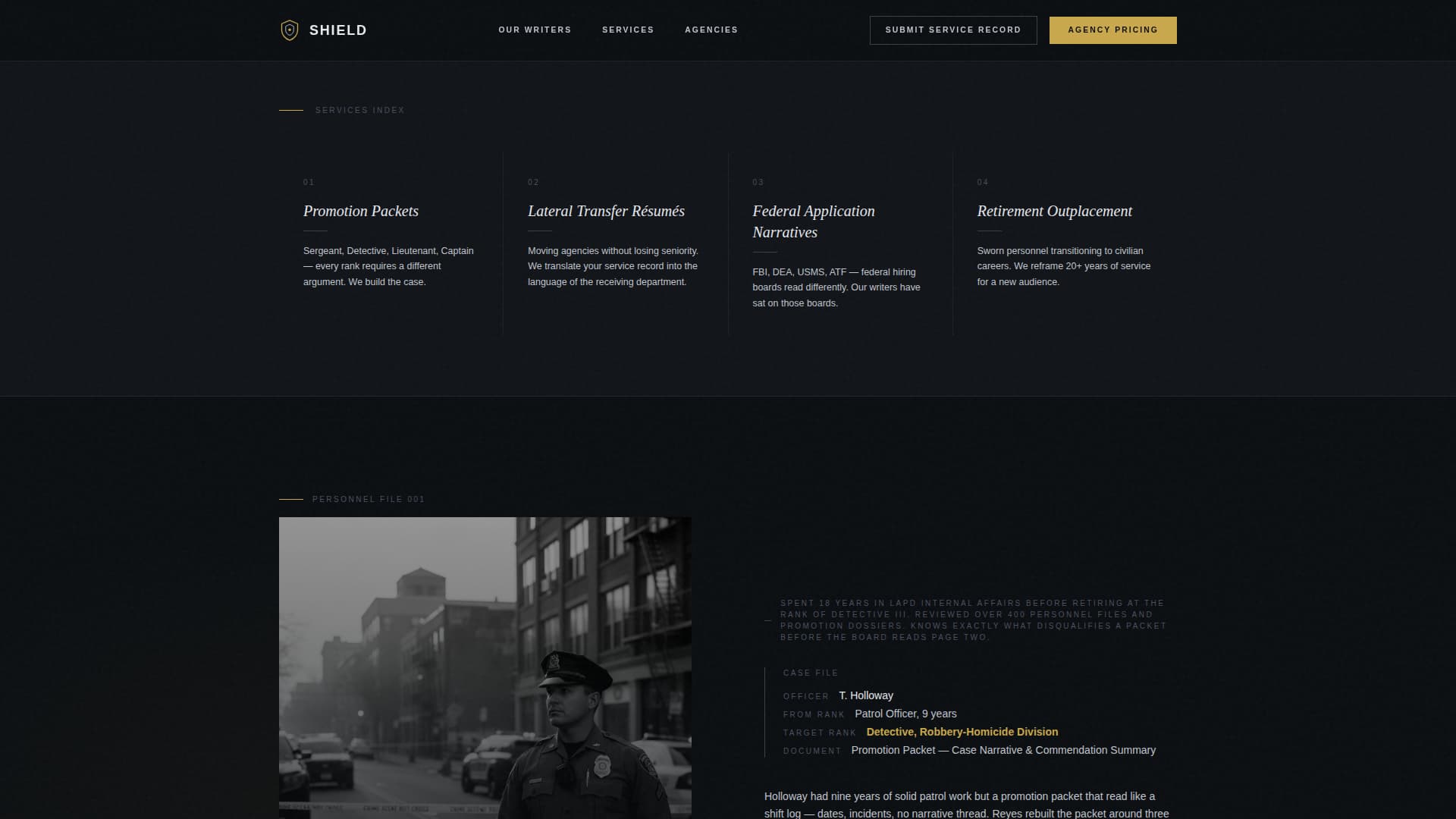 Two calls to action live in the page from the start. "Request Agency Pricing" in command gold targets department HR coordinators and command staff. "Submit Your Service Record" in the header targets individual officers. Each path routes to a different intake scoped to its audience.