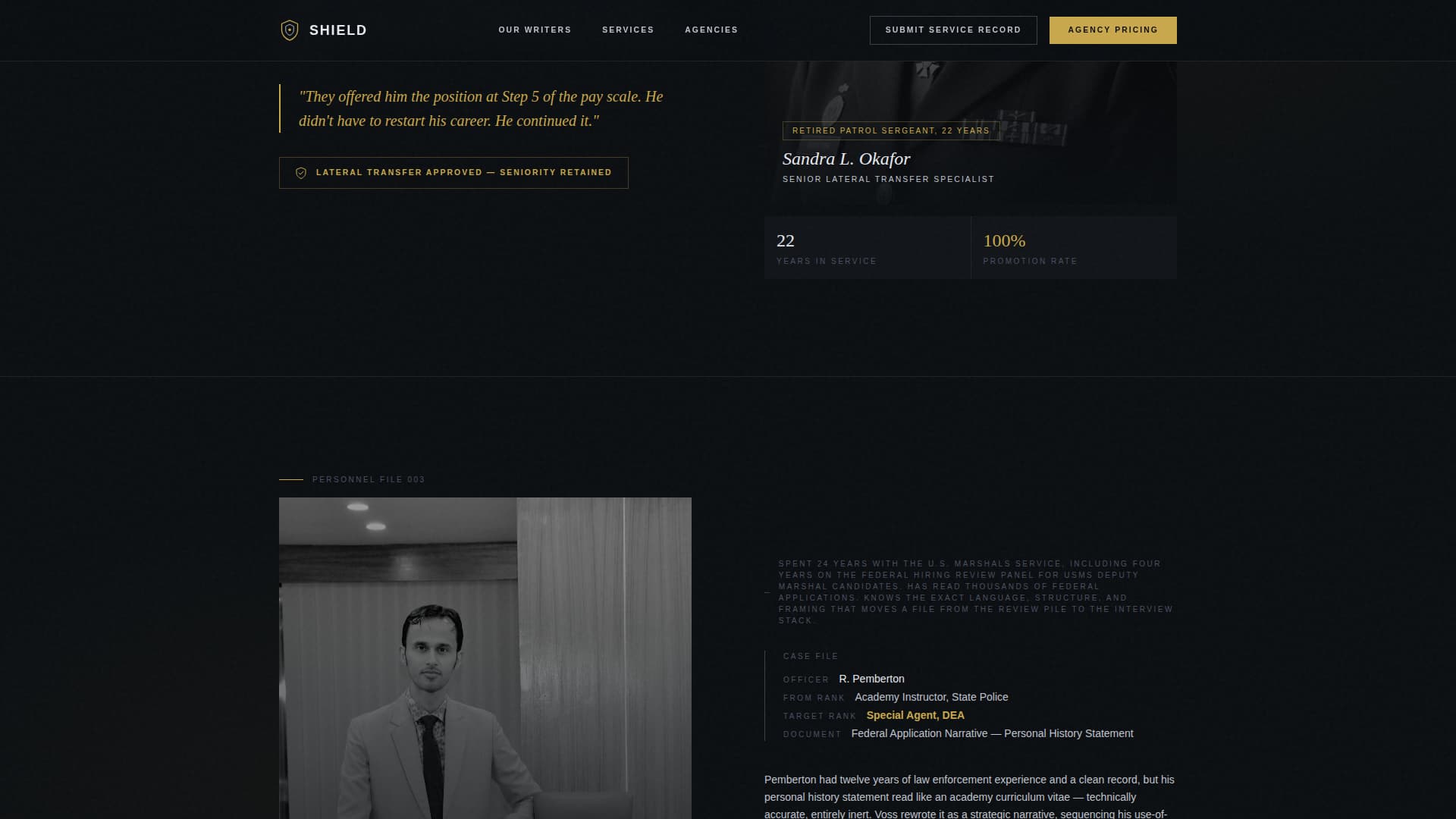 Shield is a dark immersive, single-page landing page template built for law enforcement career document services. It pairs a ceremonial animated badge hero with three writer credential spotlights, a dual conversion path for individual officers and agency partners, and a B2B partnership form, all styled in tactical black, badge silver, and command gold.
