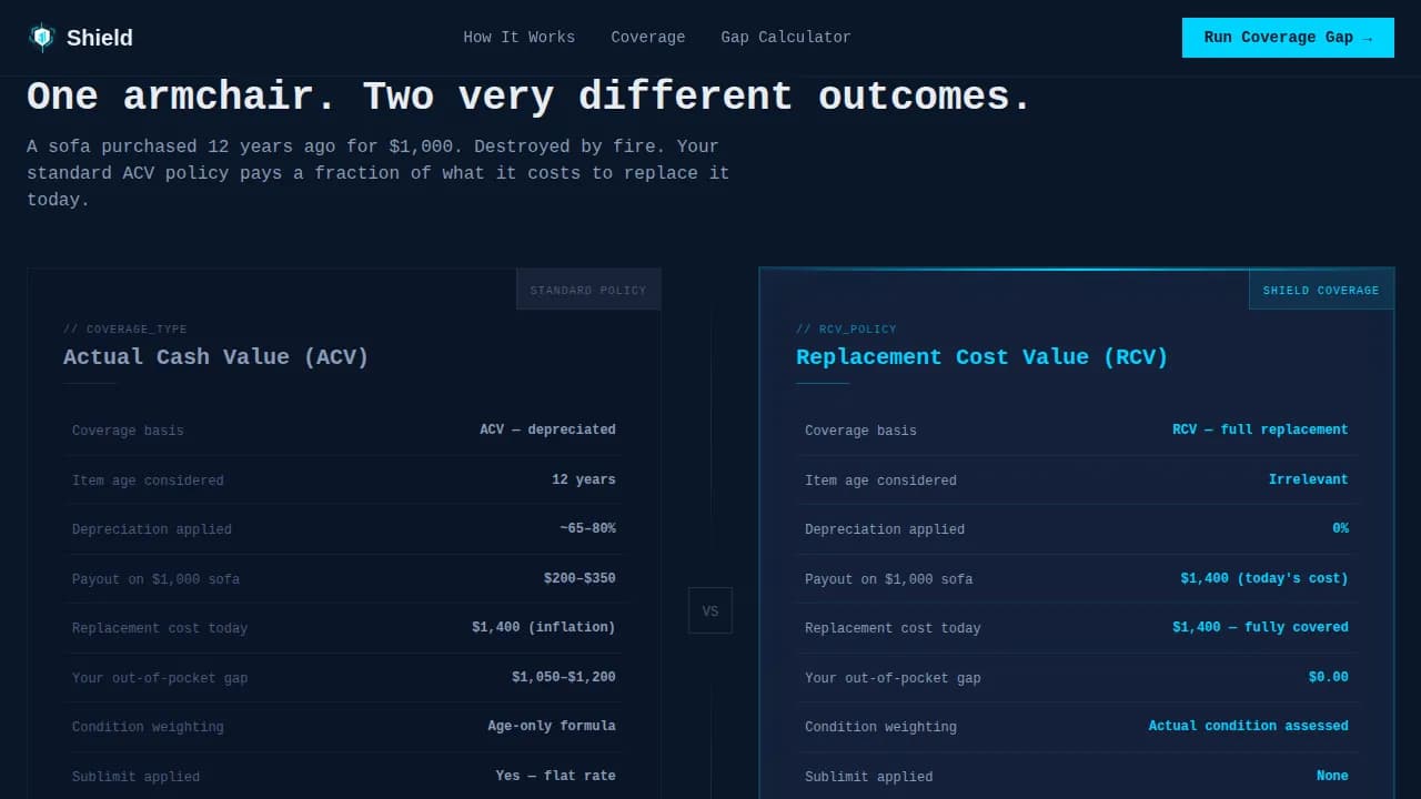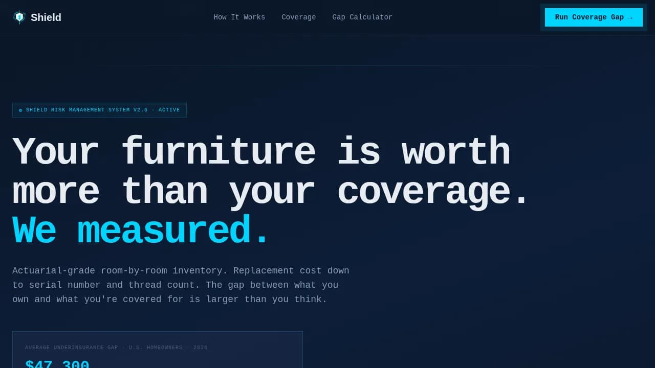 Shield is a precision-built landing page template for furniture and household insurance risk management firms. It uses a zigzag Spec Sheet layout to expose coverage gaps section by section, pairing "Their Policy" versus "Shield Coverage" comparisons with a live inline calculator. The result is a data-dense, high-converting page that makes the financial case before visitors reach the call to action.