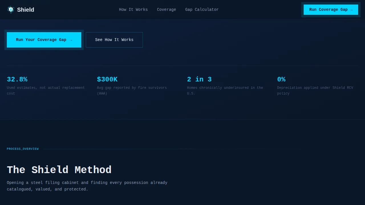 Shield is a single-page landing page template crafted for insurance and risk management companies targeting homeowners, landlords, and estate executors. It follows a Comparison/Versus design style with a Spec Sheet zigzag layout, a Midnight Blue color system, and a live coverage gap calculator. Every section is built to address underinsurance gaps with actuarial precision and cold visual authority.