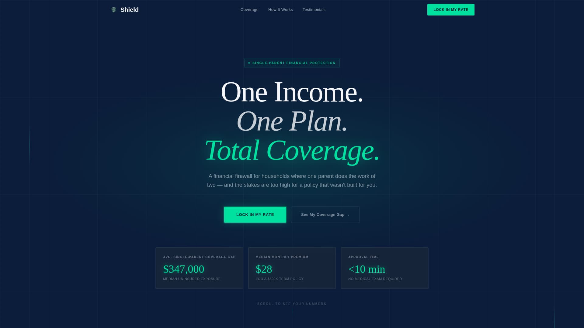 Shield is a single-page life insurance landing page template built for single-parent households. It uses a dark command-center aesthetic, interactive comparison data grids, and a three-step progressive quote form to turn financial anxiety into a concrete coverage decision. The design is desktop-first with full mobile responsiveness, built around one clear goal: locking in a rate.
