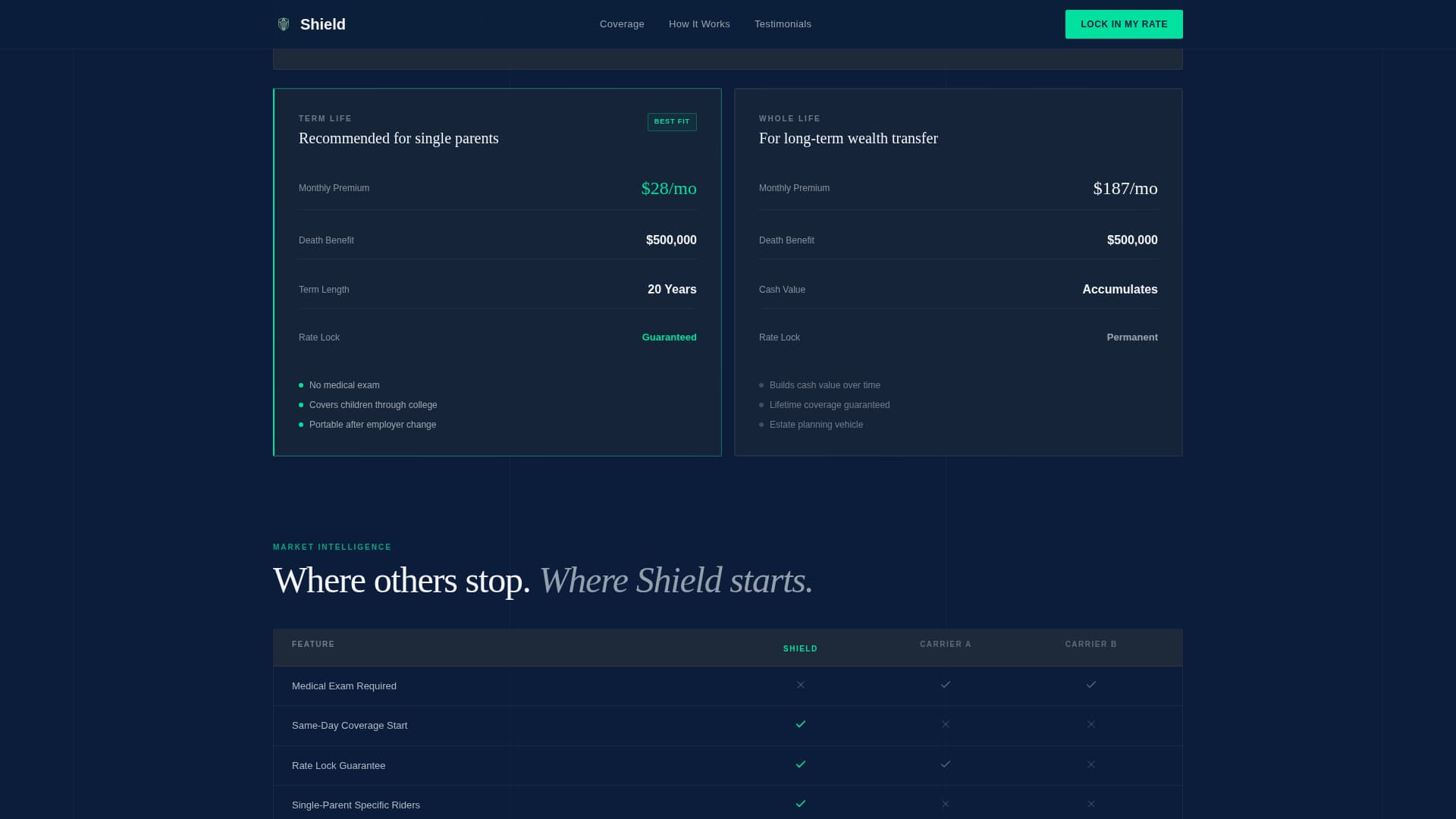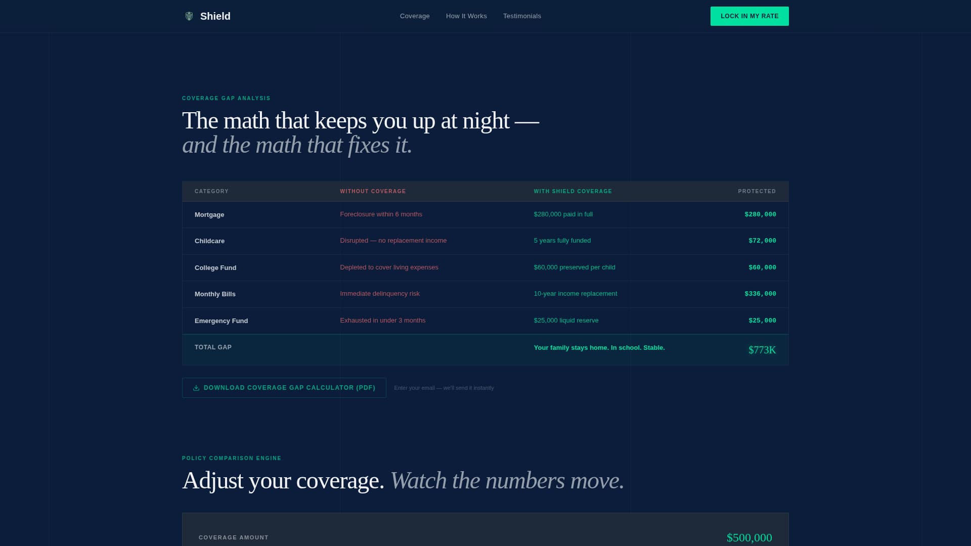 Most life insurance landing pages rely on warm photography and vague reassurance. That approach fails single parents, who arrive with specific fears and real dollar amounts in mind. Shield replaces sentiment with specificity.