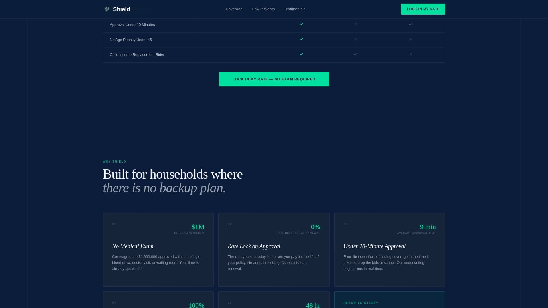 The "Why Shield" section presents five specific proof points: no medical exam requirement, instant rate lock, approval under ten minutes, payout speed, and guardian assignment capability. Each differentiator is displayed as a discrete block rather than a generic feature list.