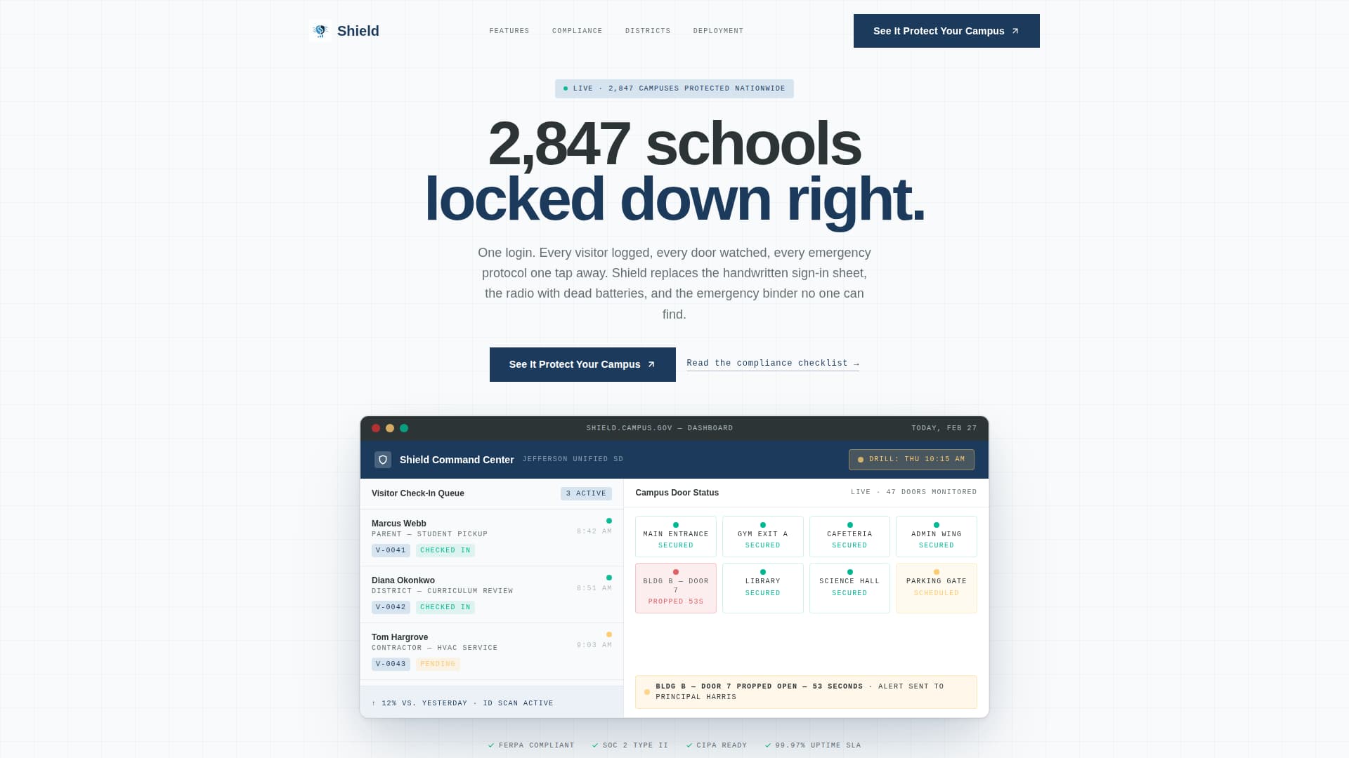 Shield is a single-column landing page template built for campus security services. It leads with hard data, walks visitors through a live dashboard screenshot, and drives clicks to an interactive demo. The layout is clean and clinical, designed to earn trust from district superintendents, principals, and school board members who need a modern security solution fast.