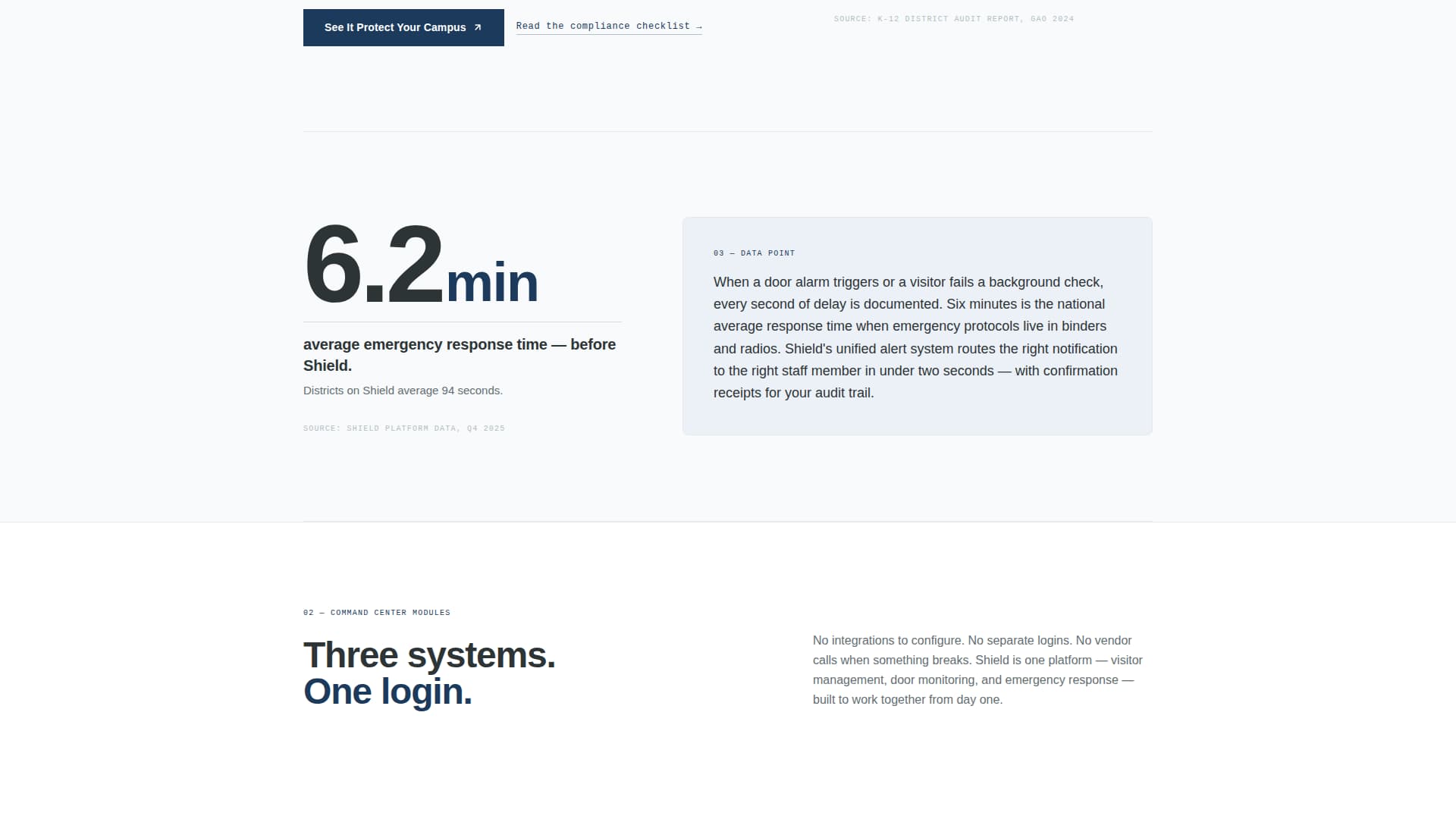 Shield is a stats-first, single-column landing page template for campus security platforms. It opens with an oversized dashboard screenshot and leads every section with a bold statistic before any explanation arrives. The design is clinical and functional, built to move decision-makers from skepticism to a demo click without asking for a form fill.