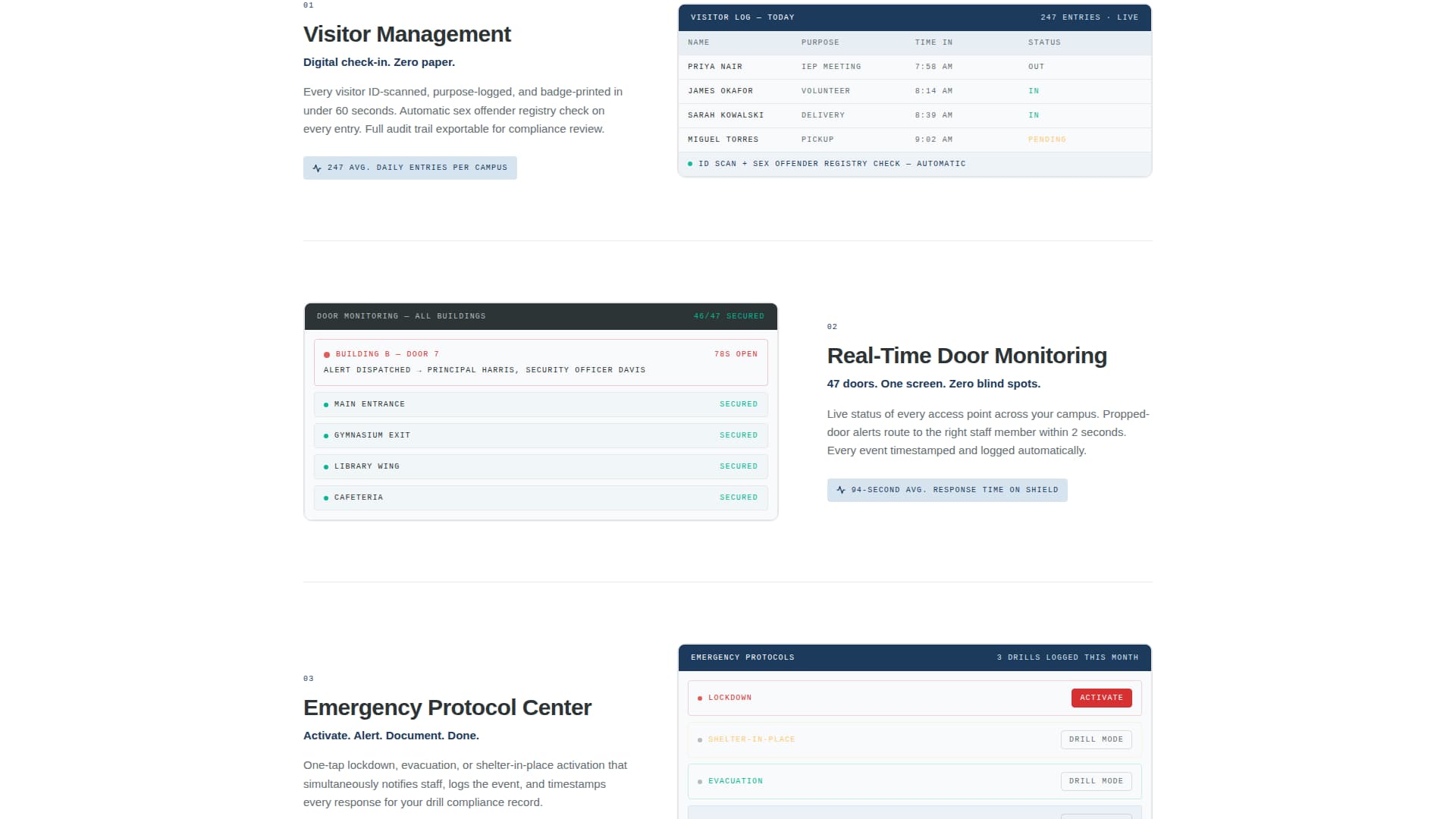 | Dashboard Screenshot Header | Opens with a device-framed platform screenshot showing live visitor, door, and drill data |