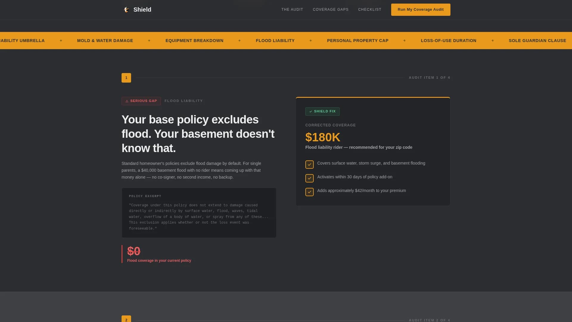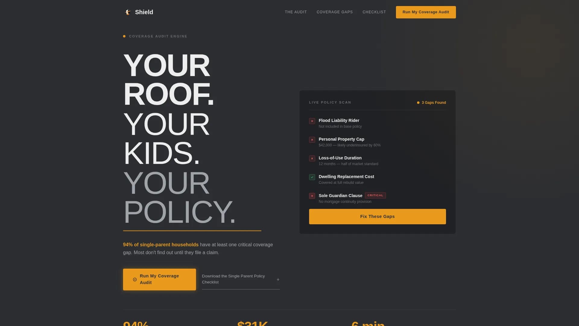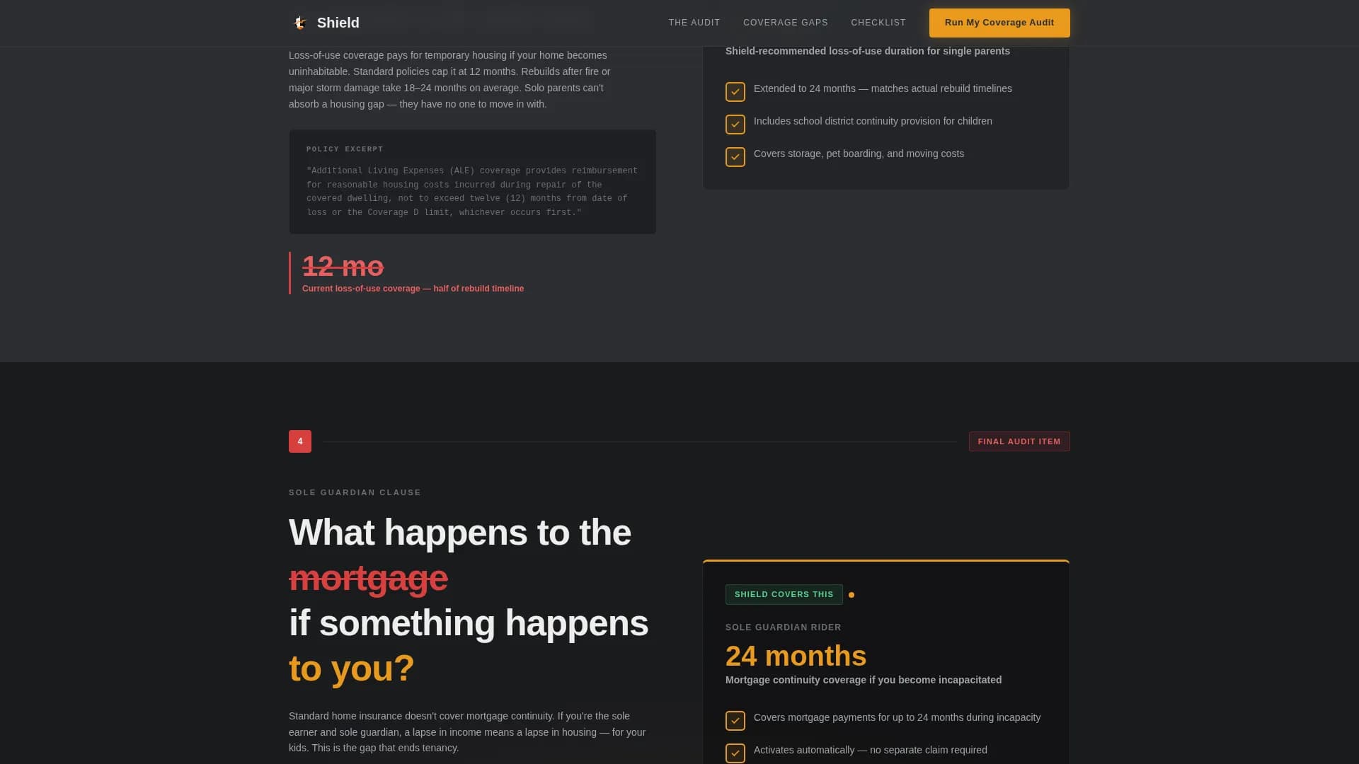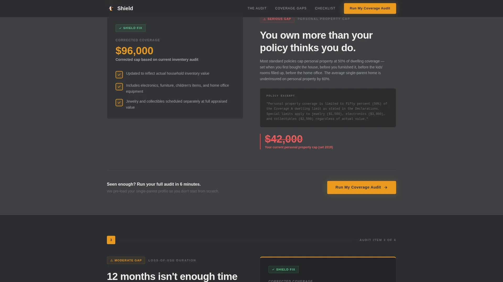 Shield is an audit-style landing page template for single-parent home insurance. It presents coverage gaps as a live policy review, using a zigzag alternating layout and a Charcoal & Amber color system. The page is built as a click-through flow that ends at a partner quoting engine, with a secondary email capture for visitors not yet ready to quote.