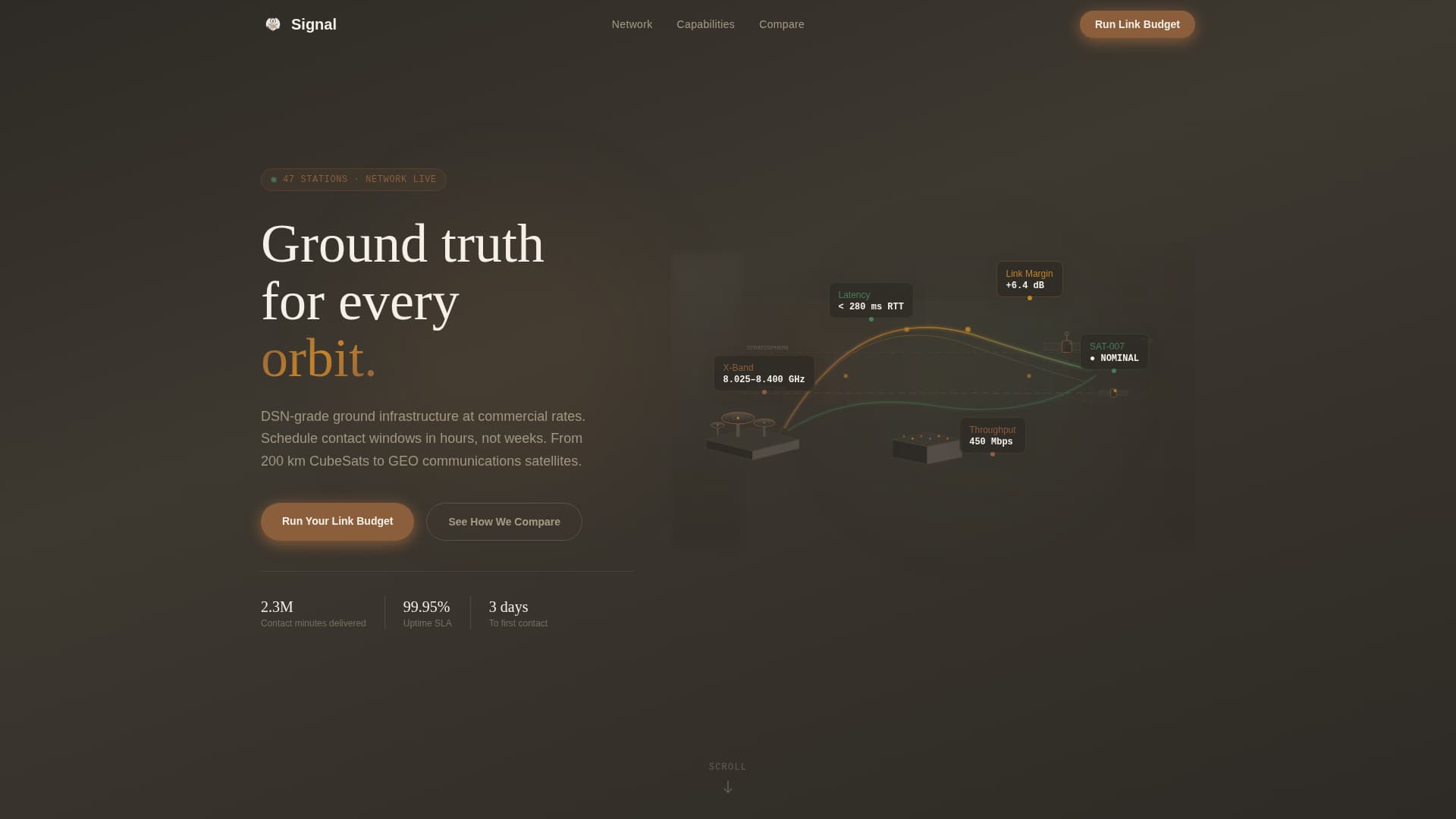 Signal is a single-page landing page template built for space communication service providers. It combines an isometric signal-chain header, zigzag alternating sections, and an inline link budget calculator to guide technical buyers from curiosity to conversion. The warm-stone color system and mission-console aesthetic make complex infrastructure feel approachable and credible.