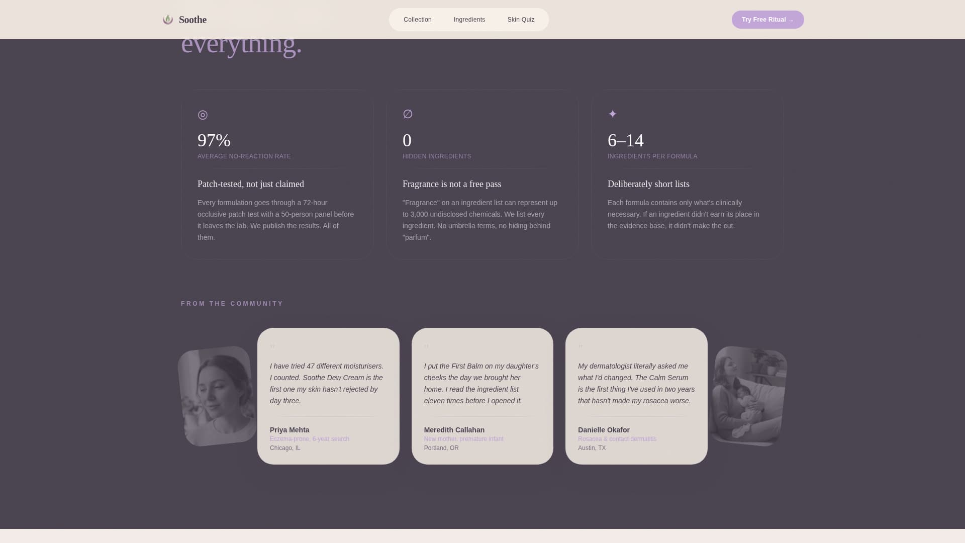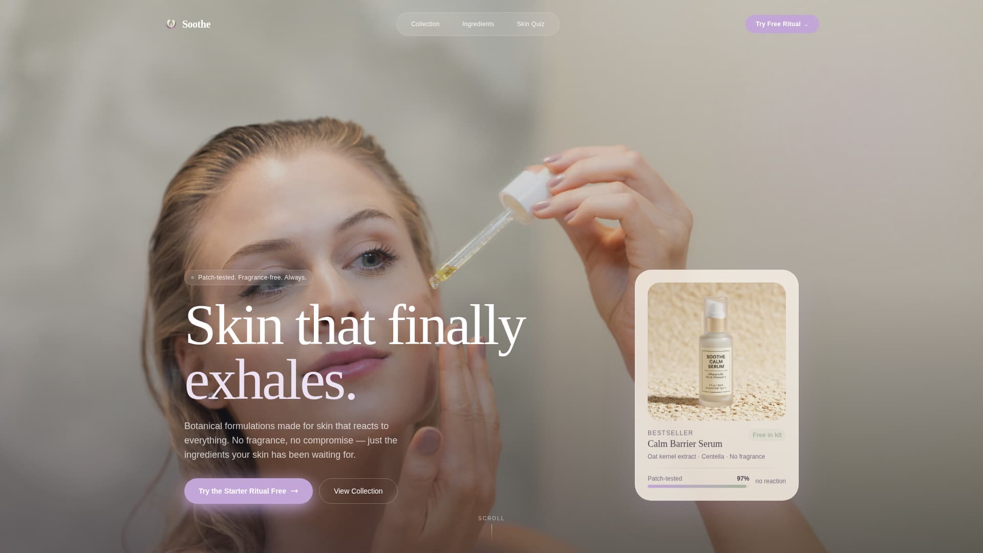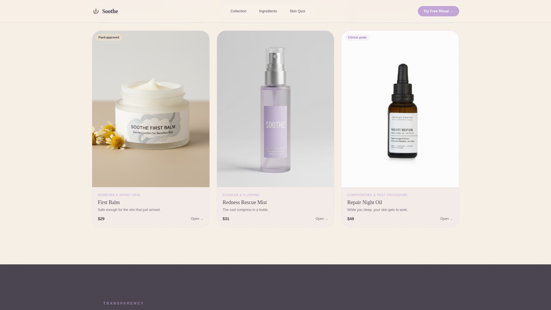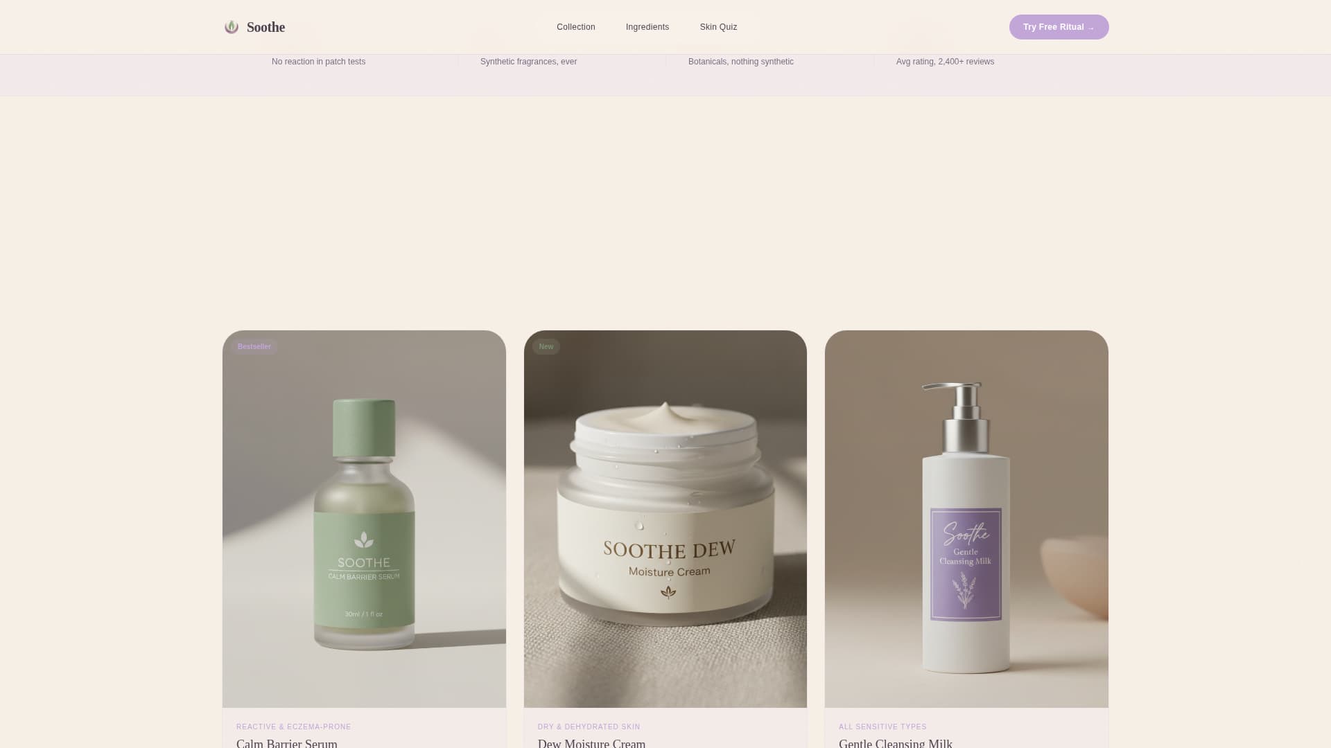 Soothe is a single-page template designed for direct-to-consumer sensitive skin brands. It opens with an intimate lifestyle header, moves into a clickable product gallery with slide-open detail panels, then earns the visitor's trust through ingredient transparency and patch-test data before presenting a free starter kit offer and a skin quiz secondary path.