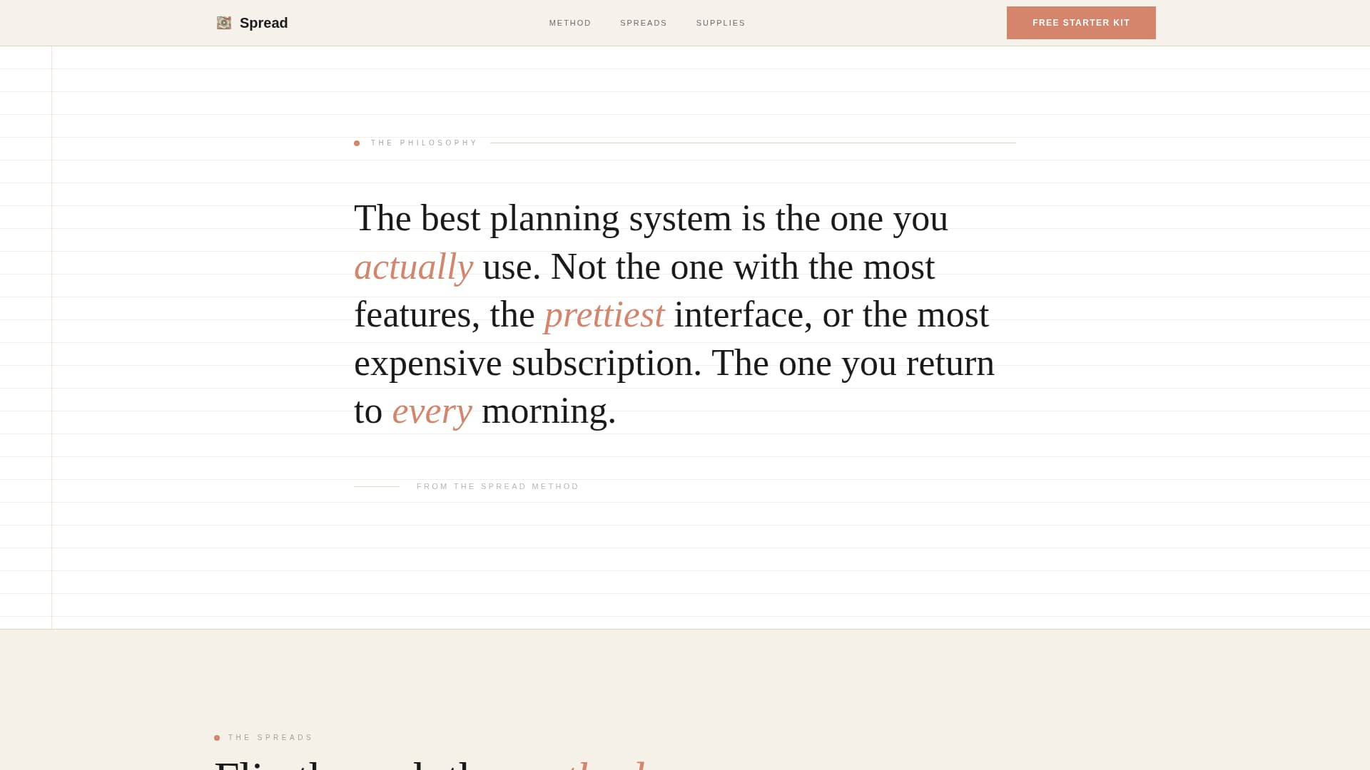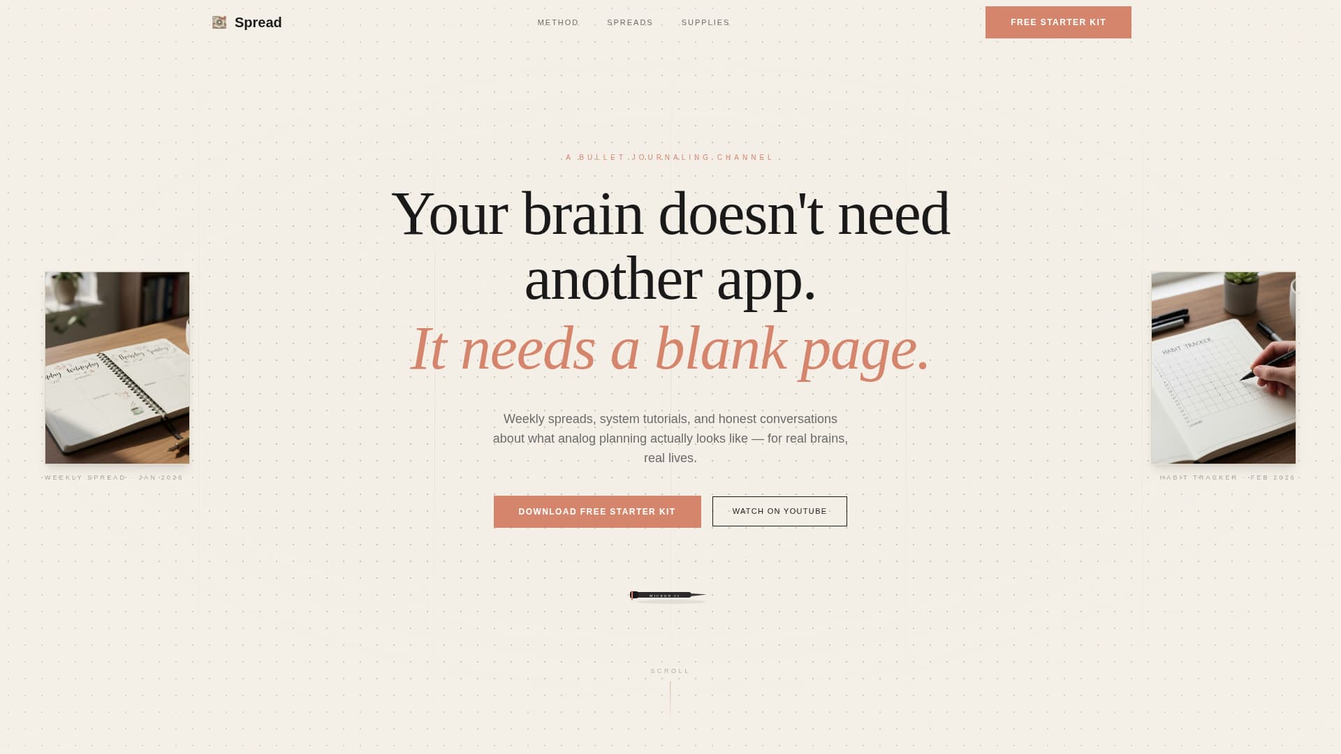 Spread is a single-page landing page template for bullet journaling and planning content creators. It combines a scroll-driven asymmetric layout with a warm analog aesthetic to move visitors naturally from inspiration to action. The primary goal is earning an email address by showcasing real spreads and offering a free downloadable starter kit.