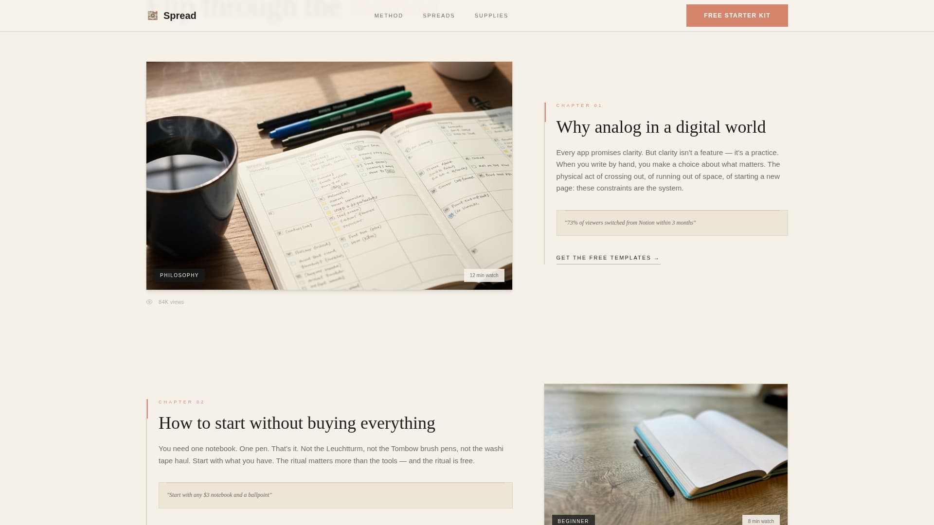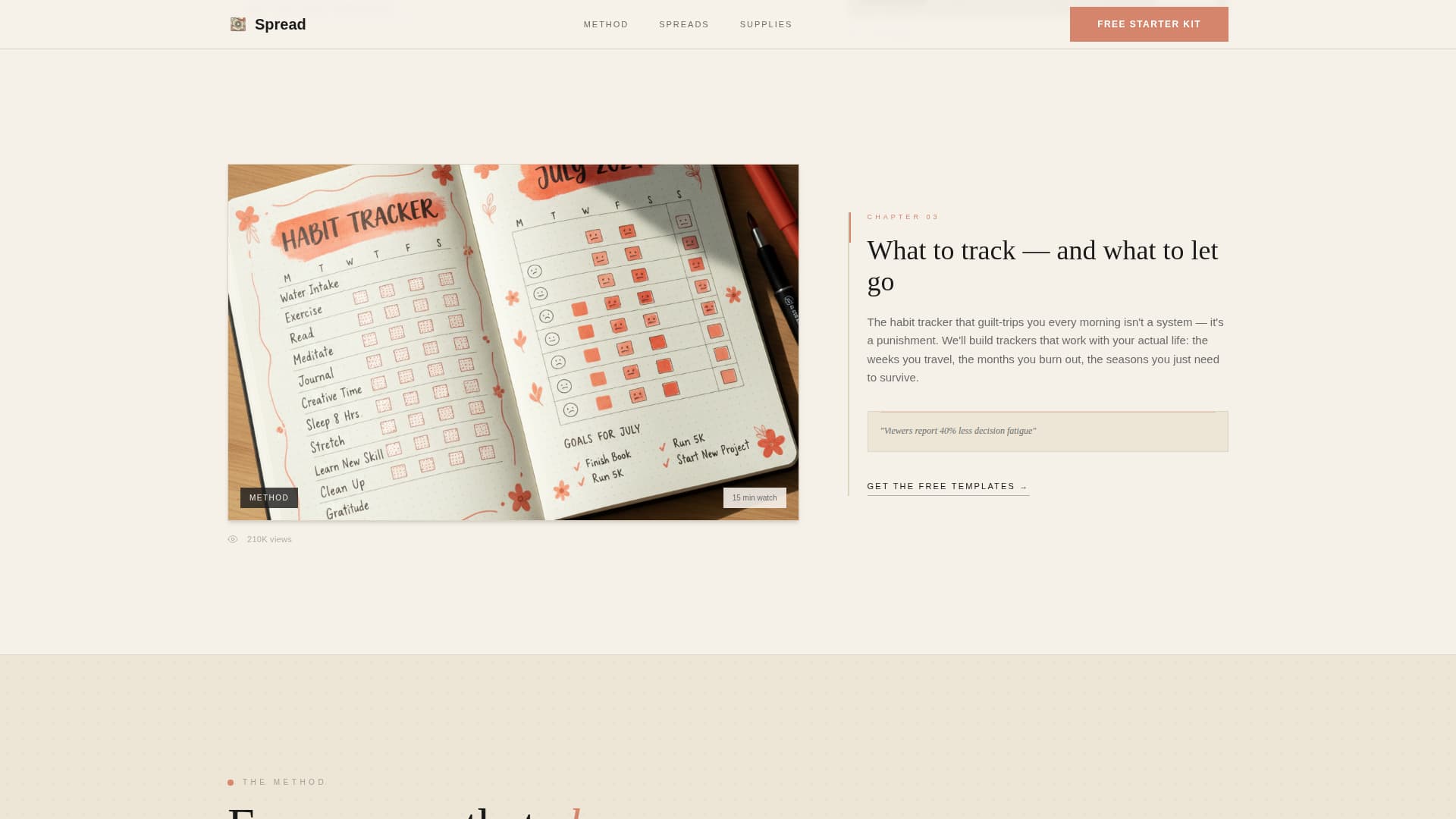 Four scroll-locked chapters walk through the creator's method: why analog, how to start, what to track, and when to let go of perfection. Each chapter alternates between inspiration and instruction, building the visitor's confidence in the system before asking anything of them.