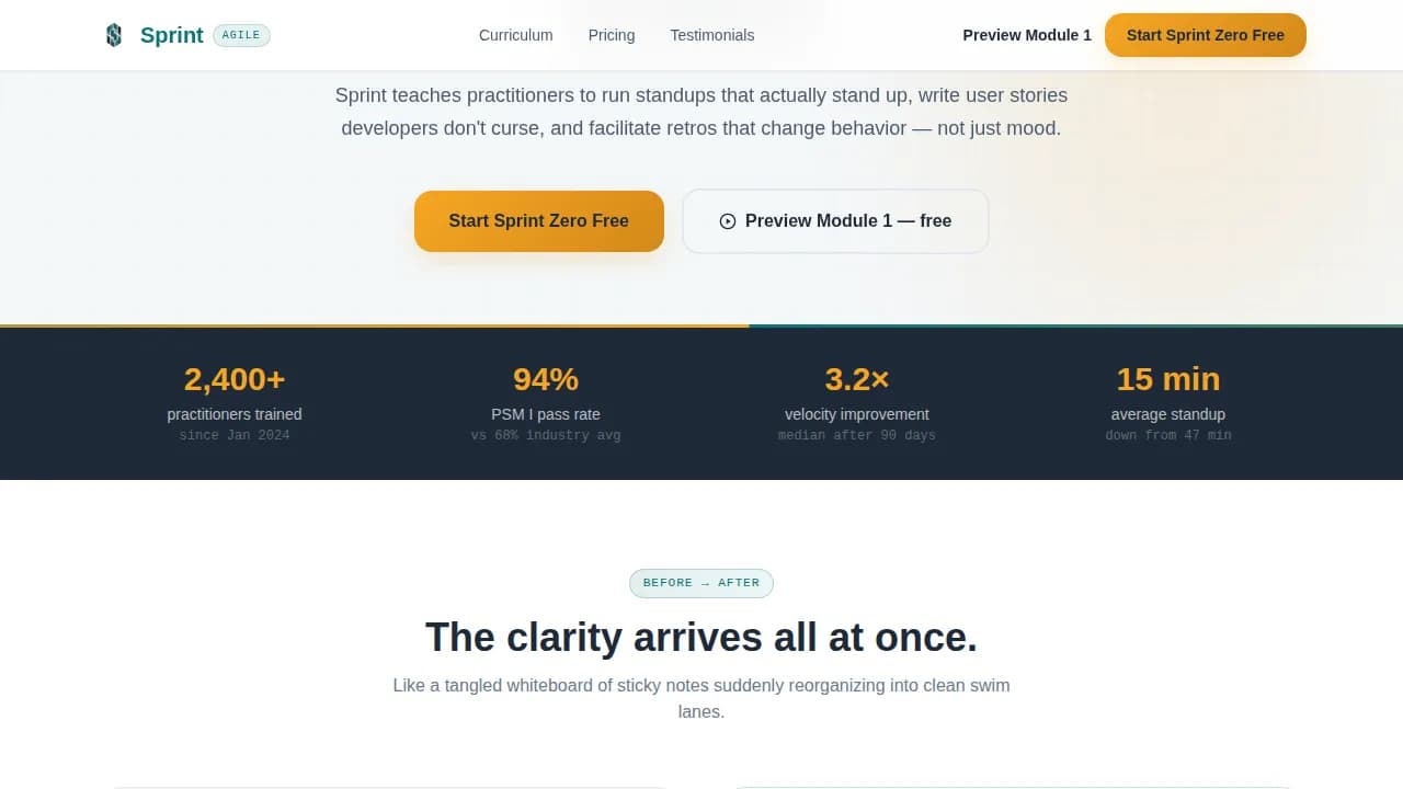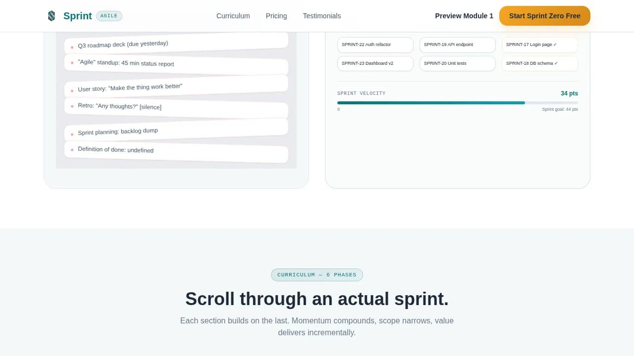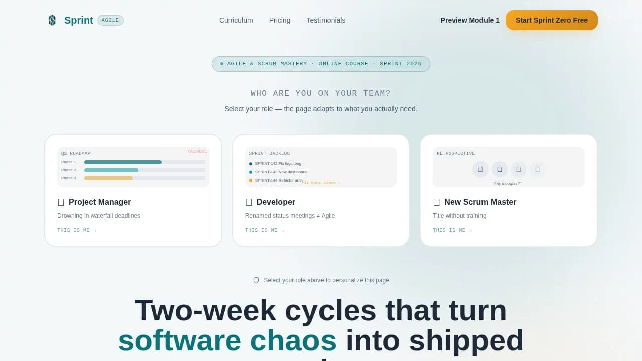 Sprint is a persona-driven Agile and Scrum online course landing page built for project managers, junior developers, and new Scrum Masters ready to stop running renamed status meetings. The template uses a Comparison Table layout, a Persona Selector header, and a freemium conversion flow to turn curious visitors into enrolled students through role-specific messaging and demonstrated course value.