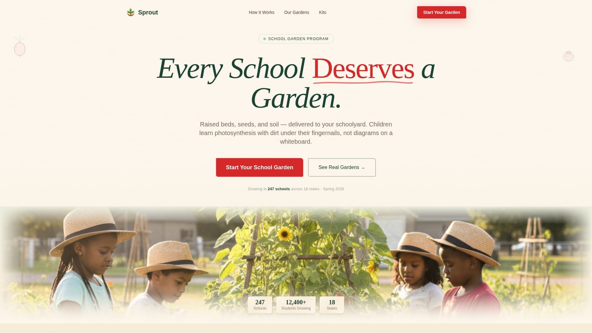 Sprout is a direct-sales landing page designed for school garden programs. It opens with a wide watercolor panorama and a hand-lettered headline, then guides visitors through garden kit tiers, real school stories, and a single checkout form. Every design choice, from the parchment background to the tomato-red call-to-action buttons, reinforces the warmth and credibility this audience needs before spending PTA or grant funds.