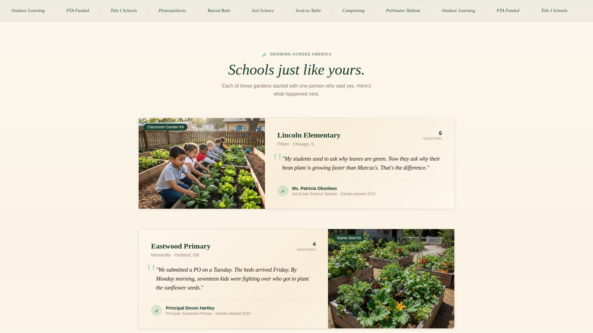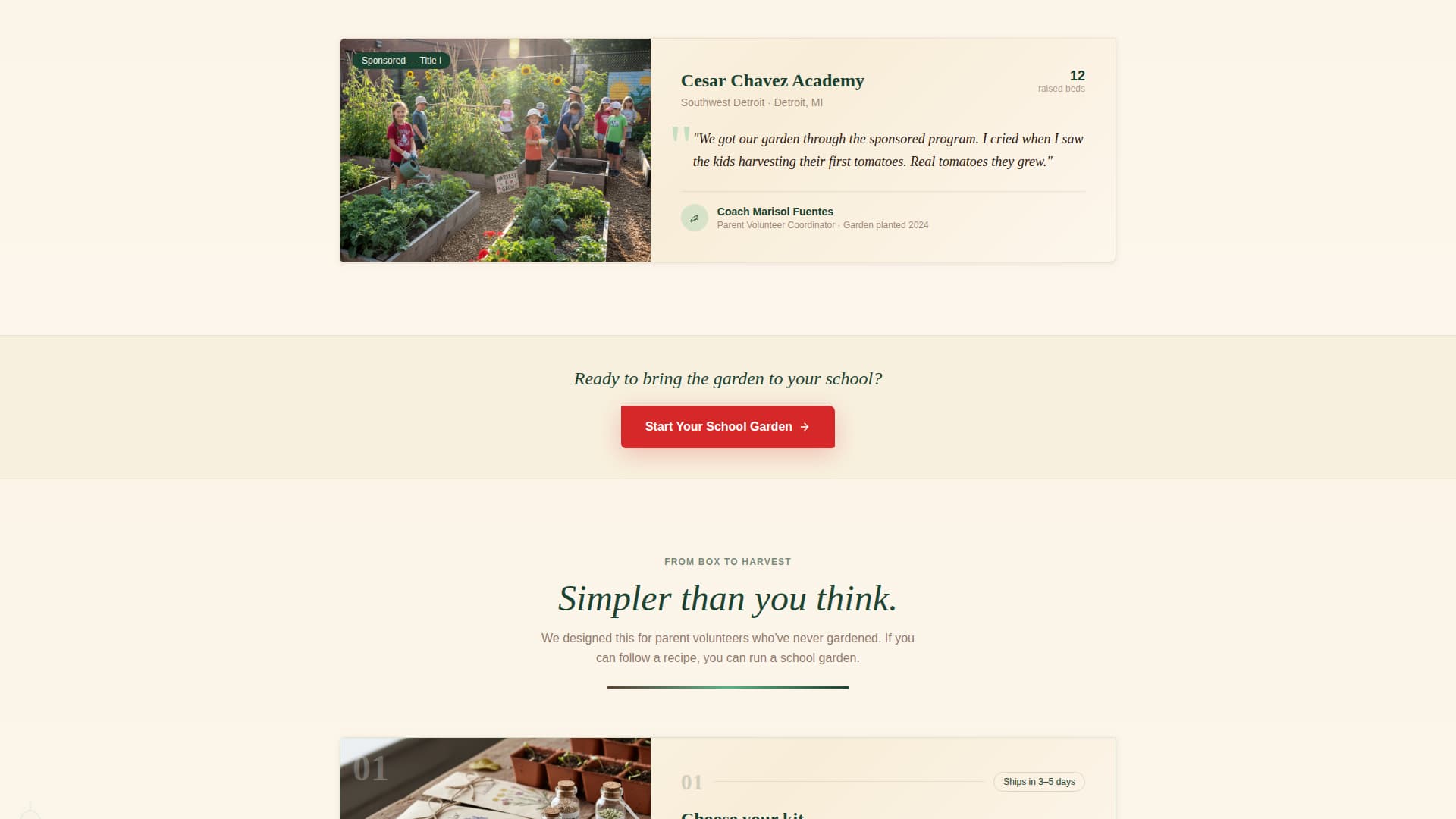 School garden programs often struggle to convert interested educators into paying buyers. A generic checkout page feels out of place for an audience that needs reassurance, a purchase order field, and a sponsored path for under-resourced schools.