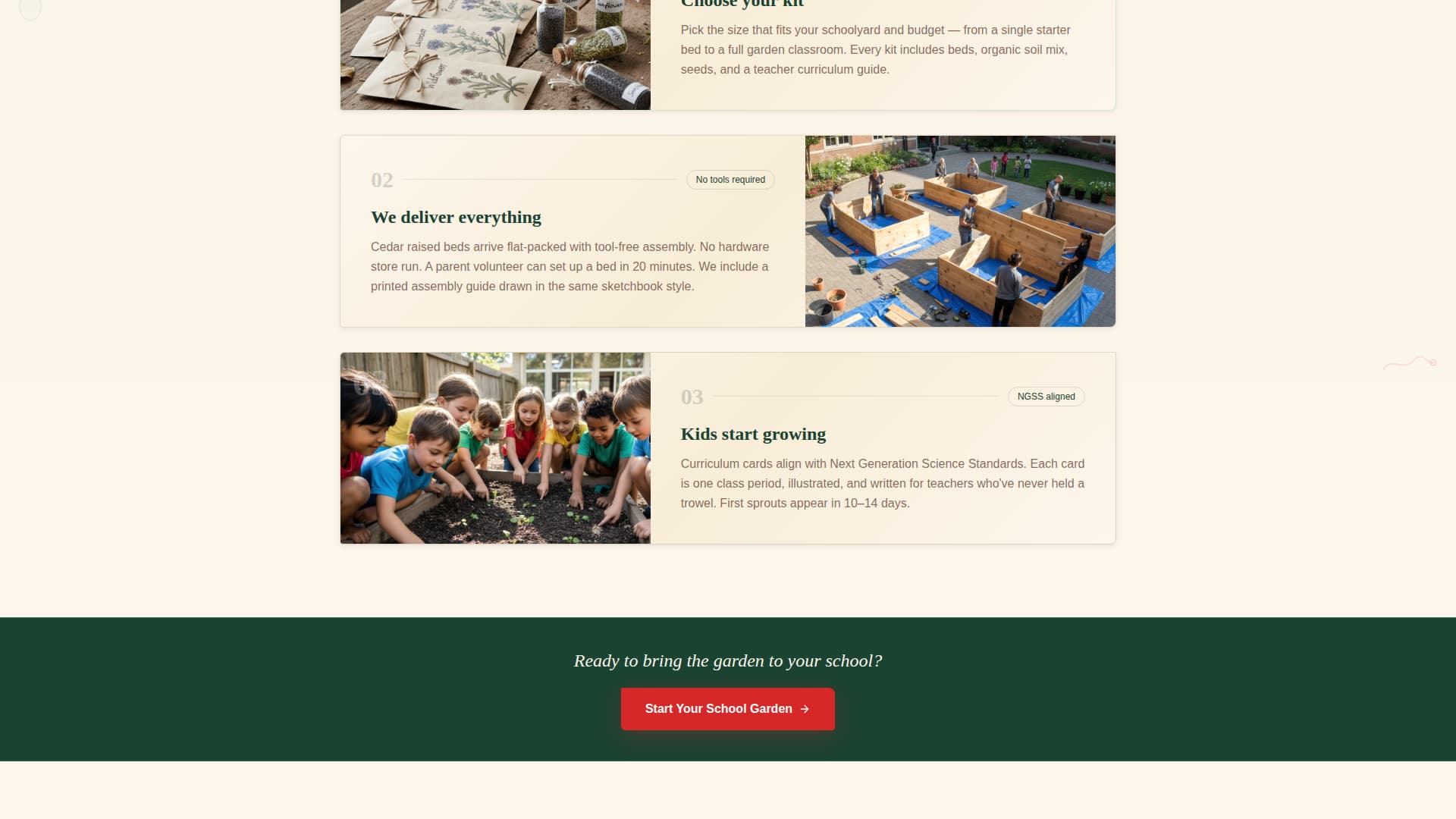 | Primary Kit call to action | First "Start Your School Garden" button placement |