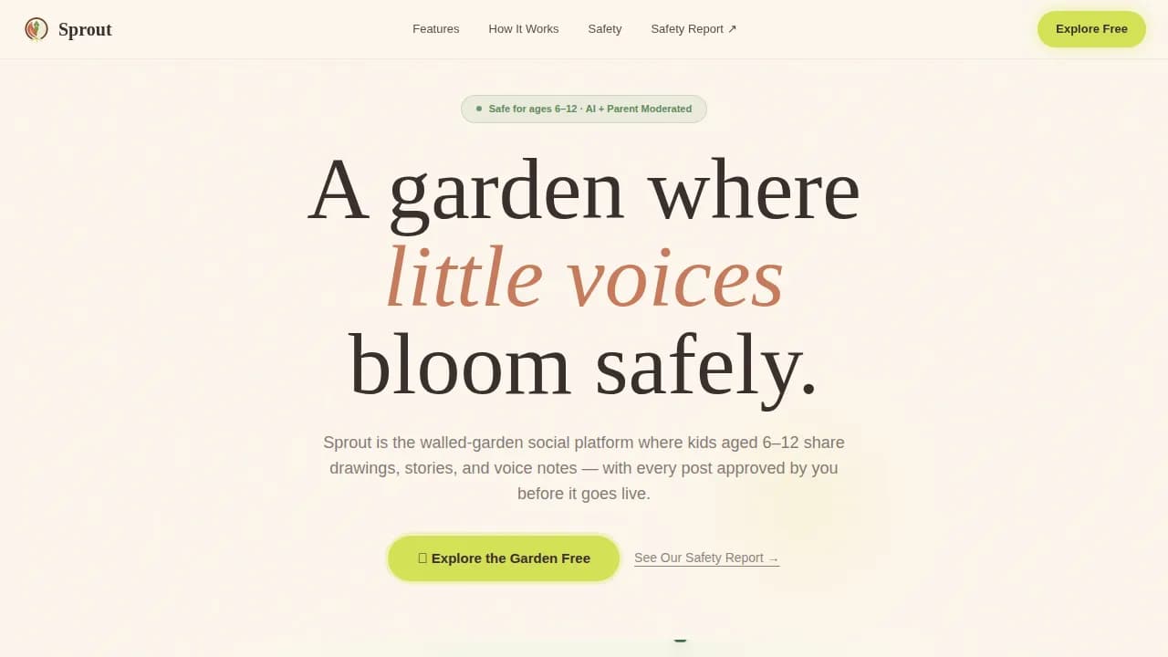 The Sprout safe kid social media landing page template is a masonry-style, single-page experience built for a walled-garden creative platform where children aged 6 to 12 share drawings, short stories, and voice notes. Every tile is an interactive demo. Every color choice earns parent trust. The primary call to action guides families toward a safe, free sign-up with zero friction on the page itself.