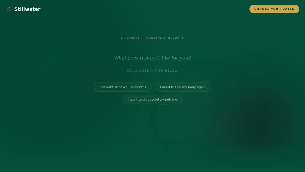 Stillwater is a single-column flow landing page template designed for luxury coastal wellness resorts. It opens with an intention-led search experience on a deep tidal green canvas and walks visitors through immersive, explorable sections. Every scroll deepens atmosphere rather than pushing a sale. The primary goal is a single click to a pre-filtered booking engine.