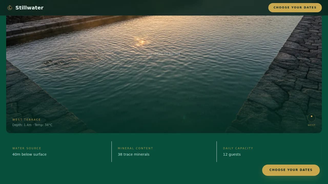 Most resort websites present a brochure. Stillwater is designed to present an atmosphere. Visitors who arrive tired of generic booking pages often leave without converting. This template keeps them engaged by letting them walk through the experience at their own pace.