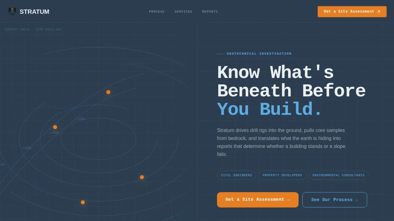 The Stratum know what lies beneath geological survey landing page template is a split-screen, blueprint-styled single-page layout built for geotechnical drilling firms. It walks civil engineers, property developers, and environmental consultants through every phase of a site investigation, from desk study to interpreted report, using an interactive topographic map hero, data-driven process sections, and a dual-path lead generation form.