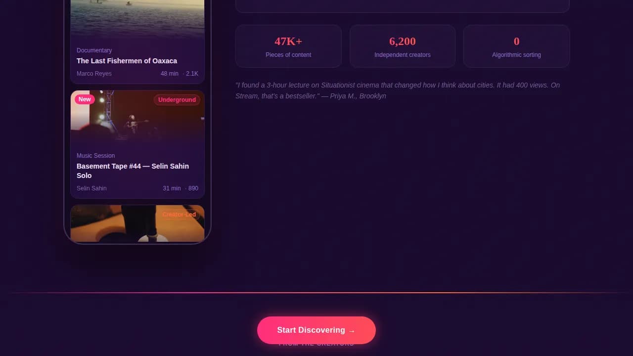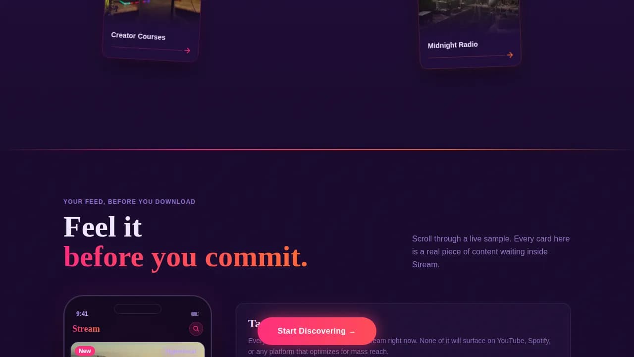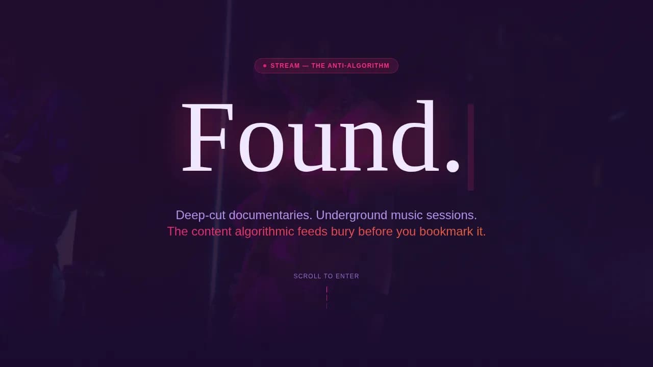 Stream is structured to move visitors through three emotional states: curiosity, conviction, and action.