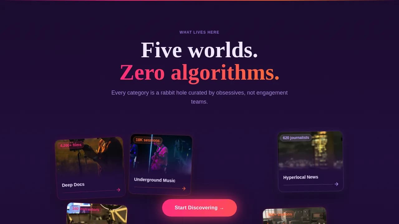 | Floating Category Cards | Surface content niches visually |