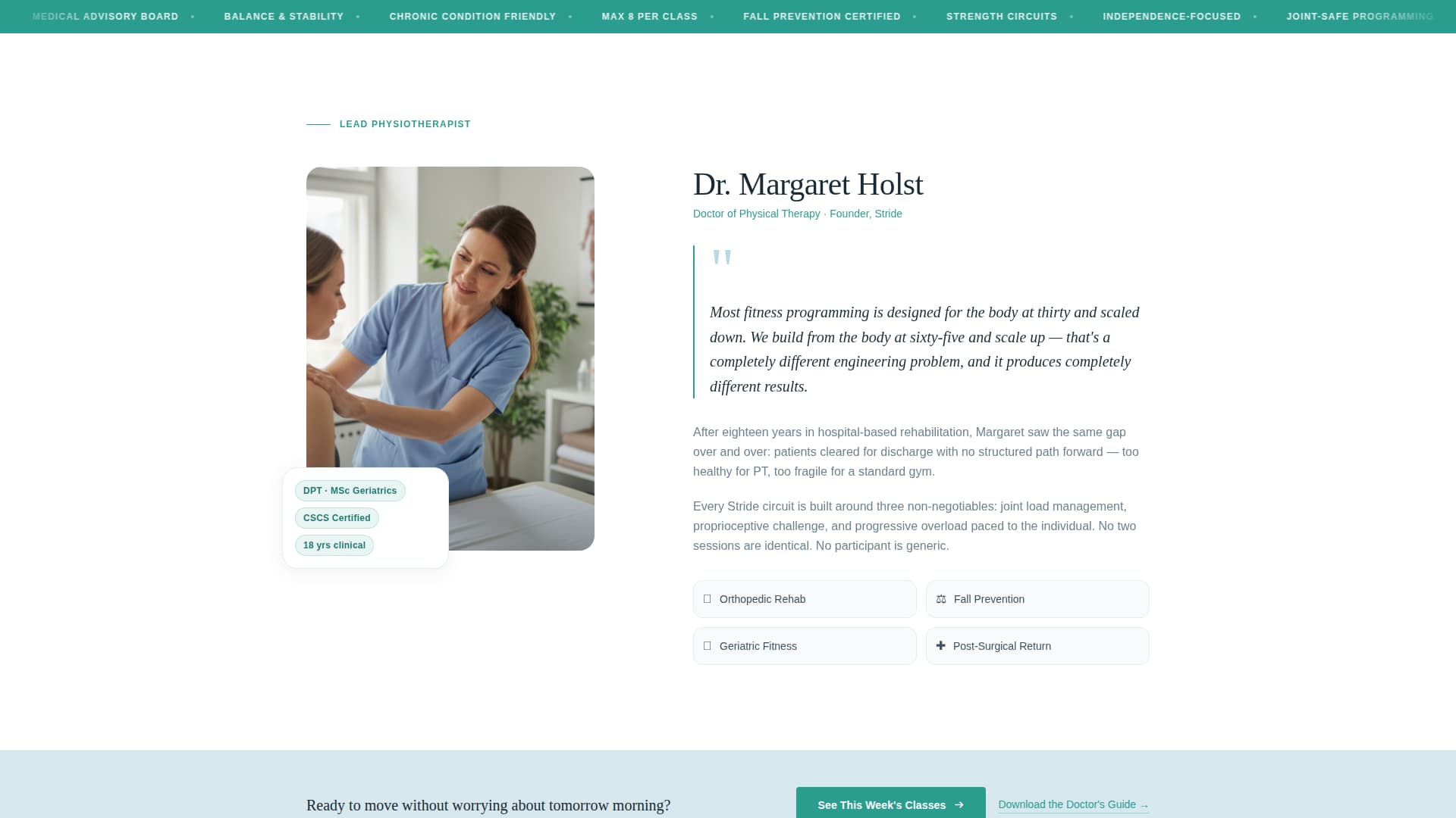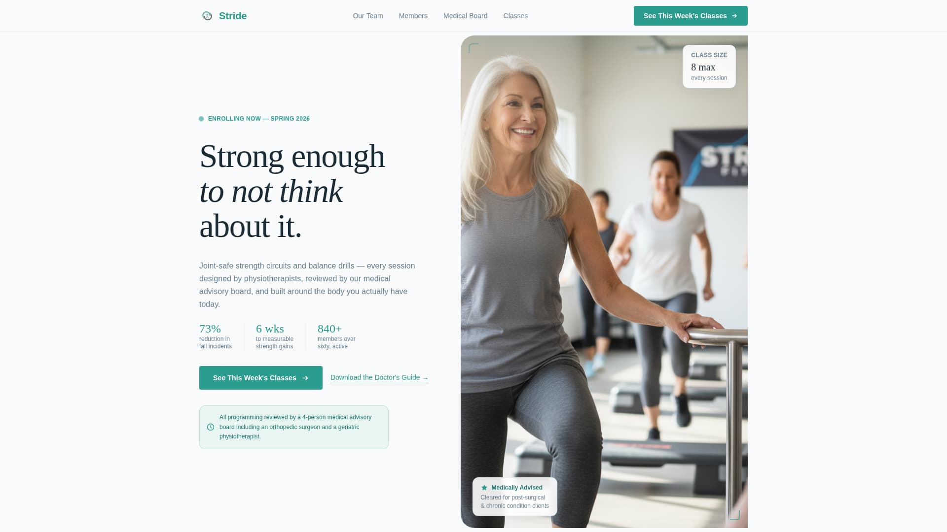 Stride is a single-column landing page template built for senior fitness programs. It pairs a half-page photo header with a clean Medical Clarity design to earn trust fast. Real faces, real credentials, and structured human proof guide visitors toward a class schedule. No forms, just a clear click-through path built for adults over sixty and the people who care for them.