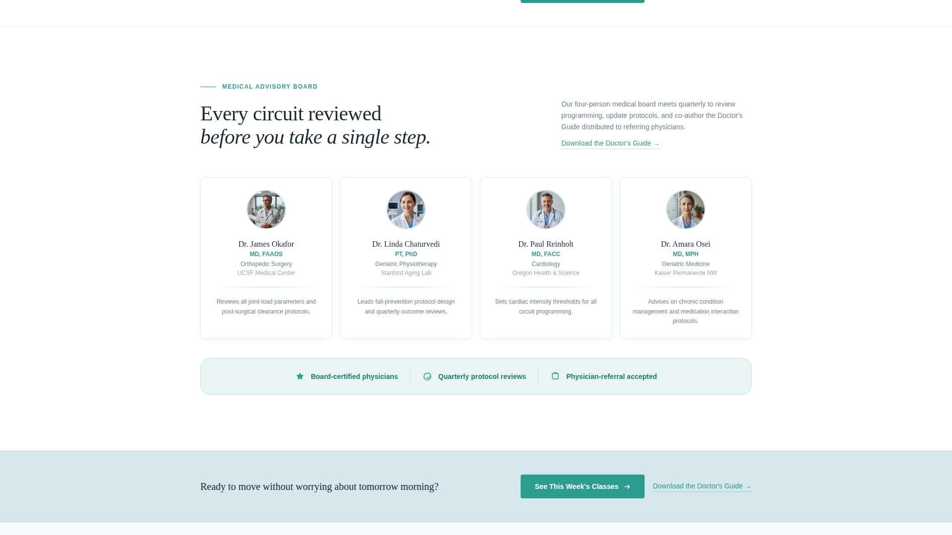 The advisory panel section displays headshot circles alongside each specialist's name and area of expertise. It signals that the program is built on clinical input, not general fitness trends.