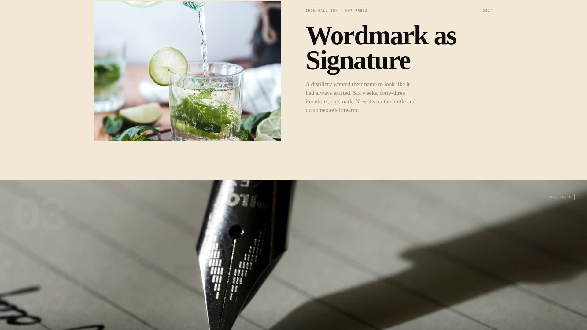 Each project section floods the screen with a macro photograph of the finished piece. As the visitor scrolls, the view pulls back to show context: an envelope held in a hand, a sign above a door, a logotype on a bottle. Brutalist colophon-style type blocks slam project name, medium, and year into the margin.