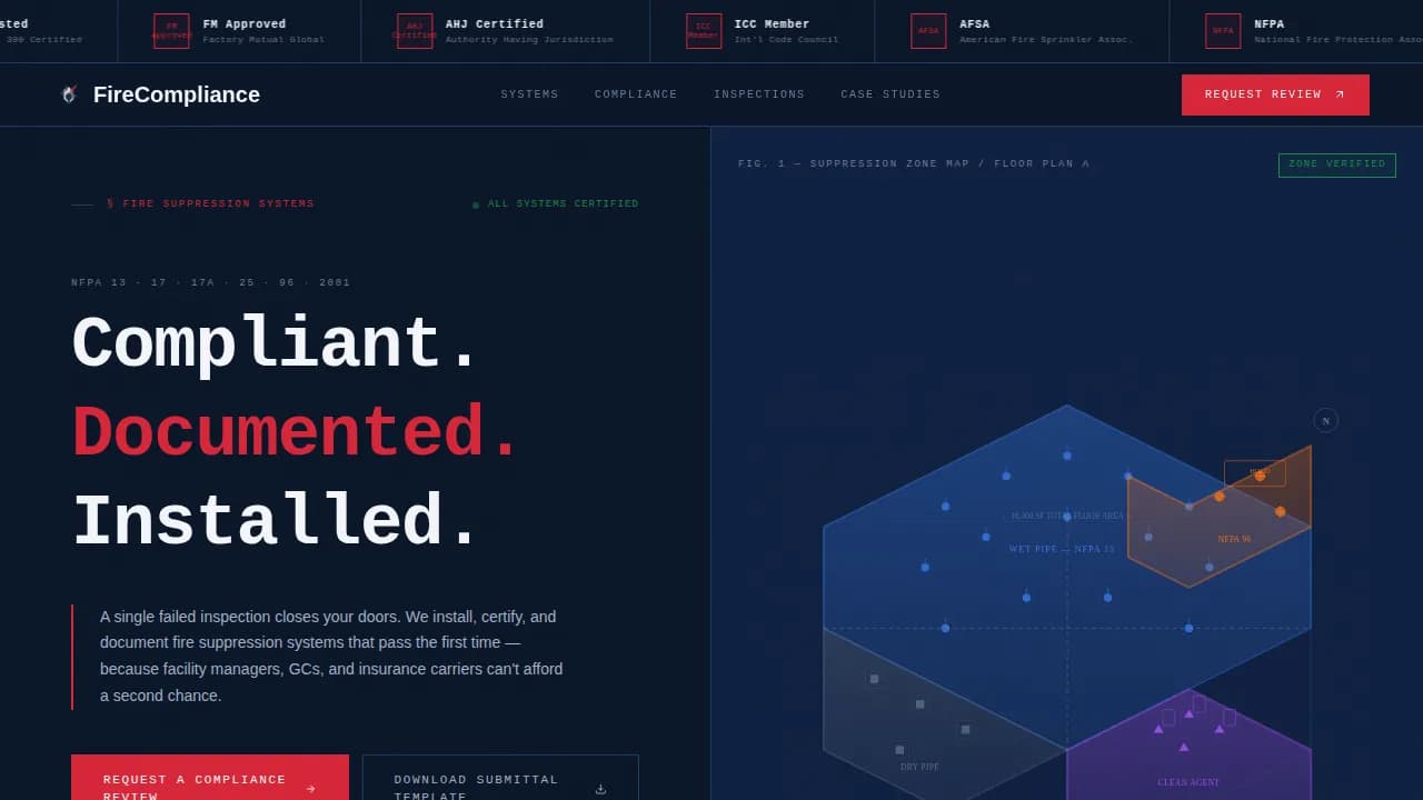 Fire suppression contractors often struggle to communicate technical authority online. A generic website fails buyers who need to check system specifications, review compliance details, and assess credentials before making contact. This template solves that gap.