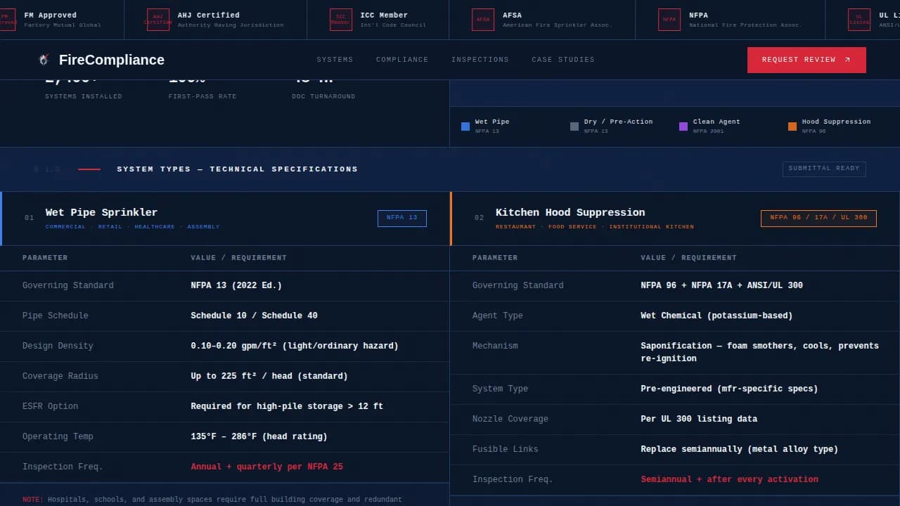 Four fire suppression system types are presented in tabular format: wet-pipe sprinkler, dry-pipe sprinkler, clean agent, and kitchen hood suppression. Each row includes pipe schedules, flow rates, agent concentrations, and coverage radii. B2B buyers can assess which suppression system fits their specific needs without a phone call.