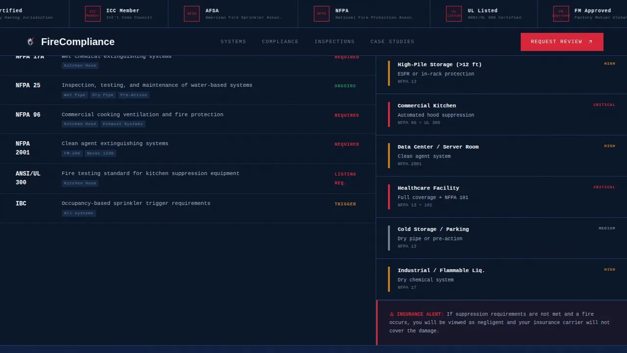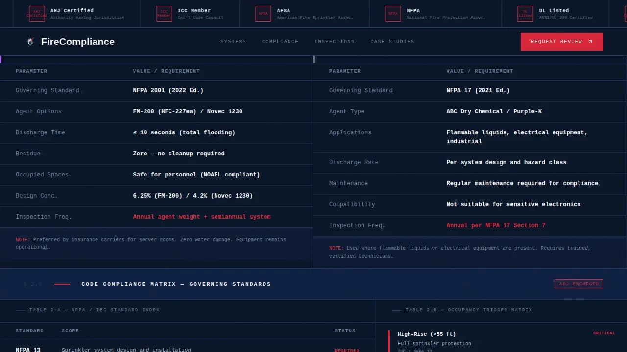 | Code Compliance Matrix | NFPA standards table and occupancy trigger grid |