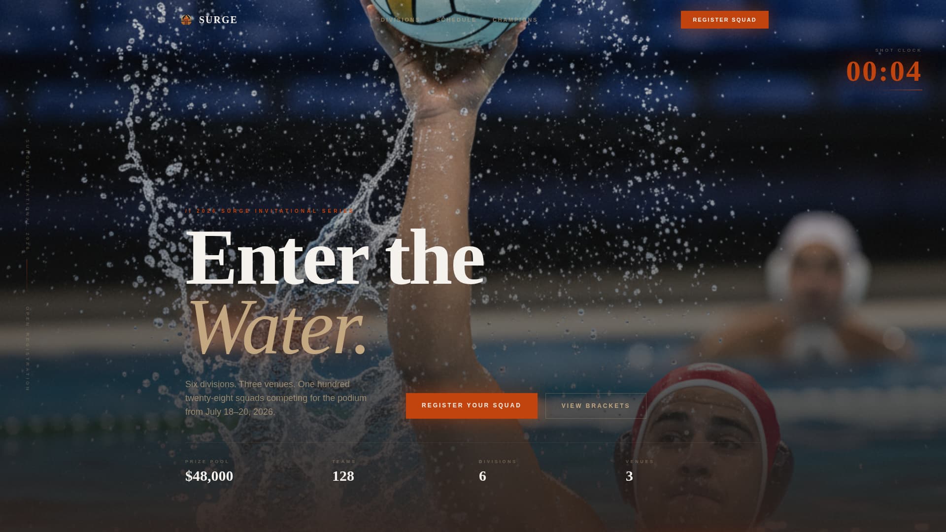 Surge is a single-page tournament registration landing page designed specifically for competitive water polo events. It opens with a hyper-detailed macro photograph, pulls visitors into an immersive scroll journey, and closes with a direct registration flow. The design feels like poolside intensity: warm, gritty, and built to move coaches from curiosity to confirmed entry.