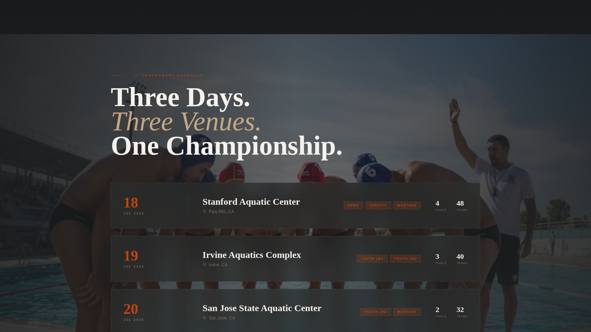 Surge is built for the people who run competitive water polo. If you organize invitationals, regional qualifiers, or exposure tournaments, this template gives you a professional front door that earns trust before asking for a registration fee.
