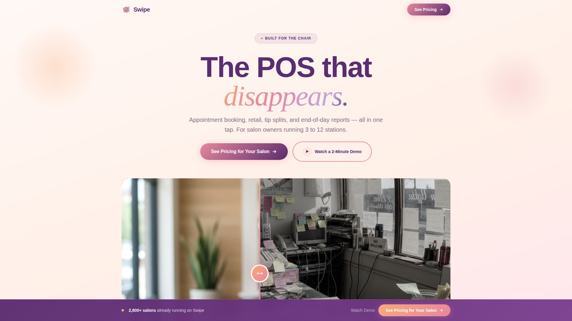 Swipe is a single-column salon point-of-sale landing page template built for stylists and salon owners managing three to twelve stations. It guides visitors through an unboxing-style scroll experience, from a Before/After hero slider to animated interface reveals and daily workflow moments, all wrapped in a warm sunset gradient palette designed to feel as effortless as the system it promotes.