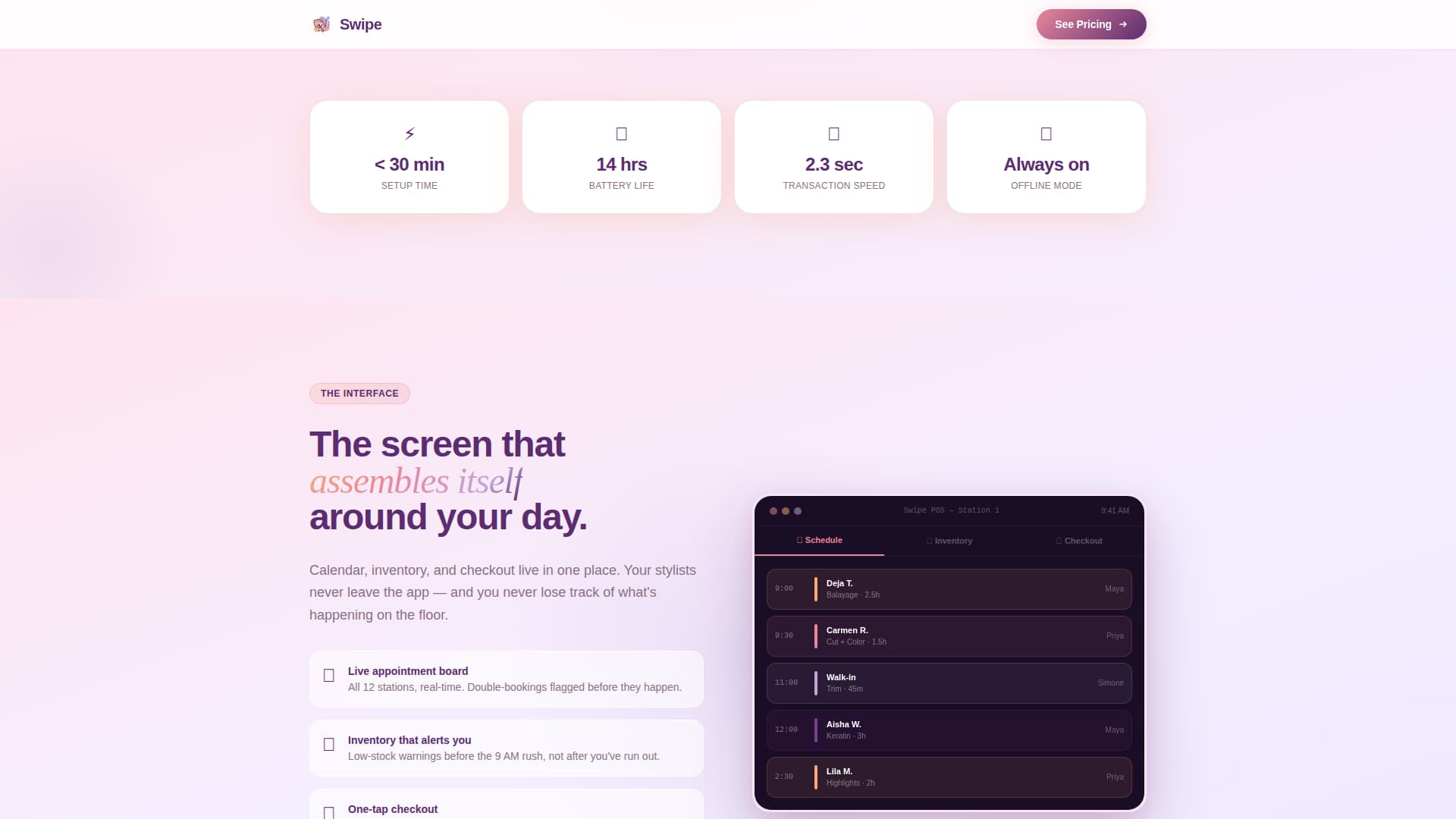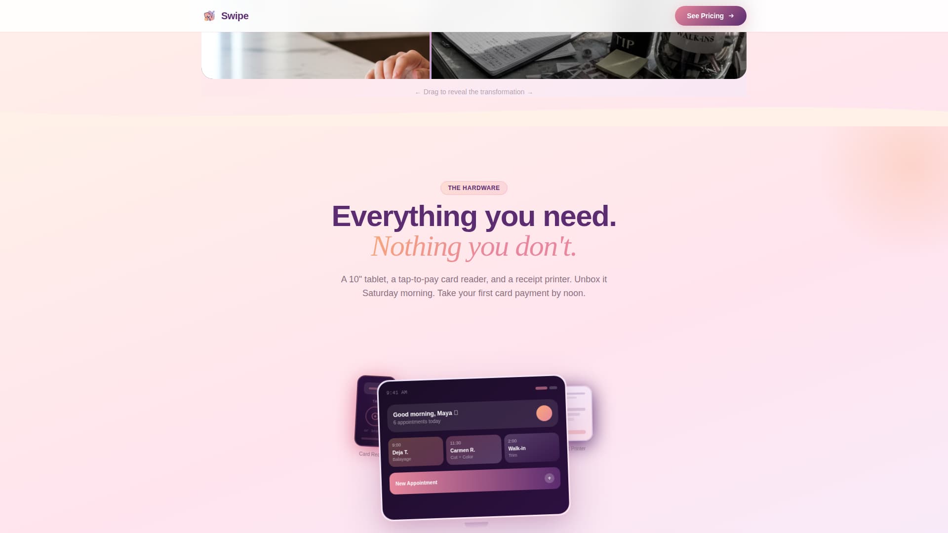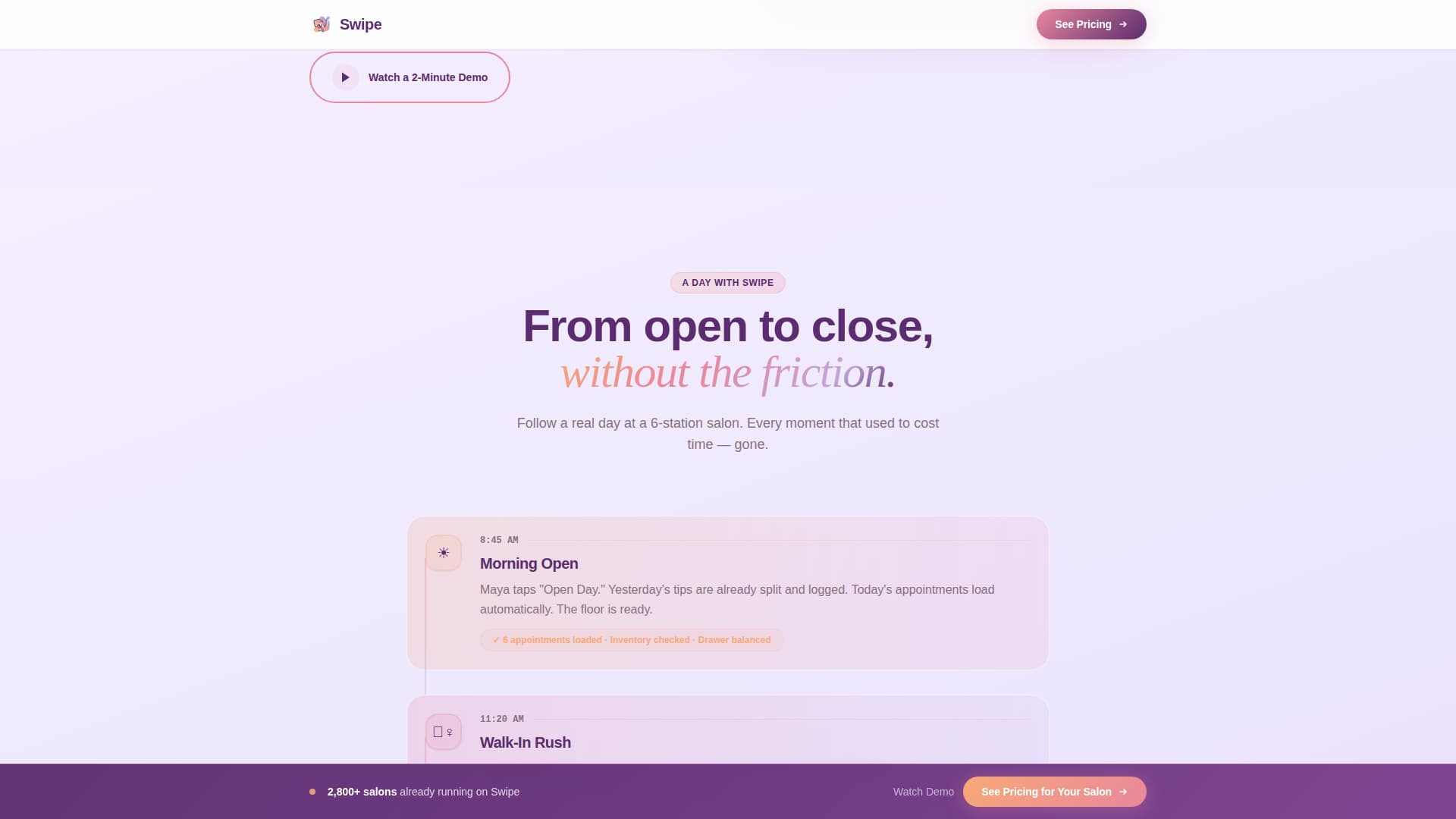 Swipe is a single-column flow landing page template for a salon point-of-sale system. It targets salon owners who juggle appointments, retail, and tip splits across multiple stations. The page walks visitors through an unboxing scroll experience, builds trust through animated interface moments, and drives clicks to a pricing page, all without asking for a form fill.