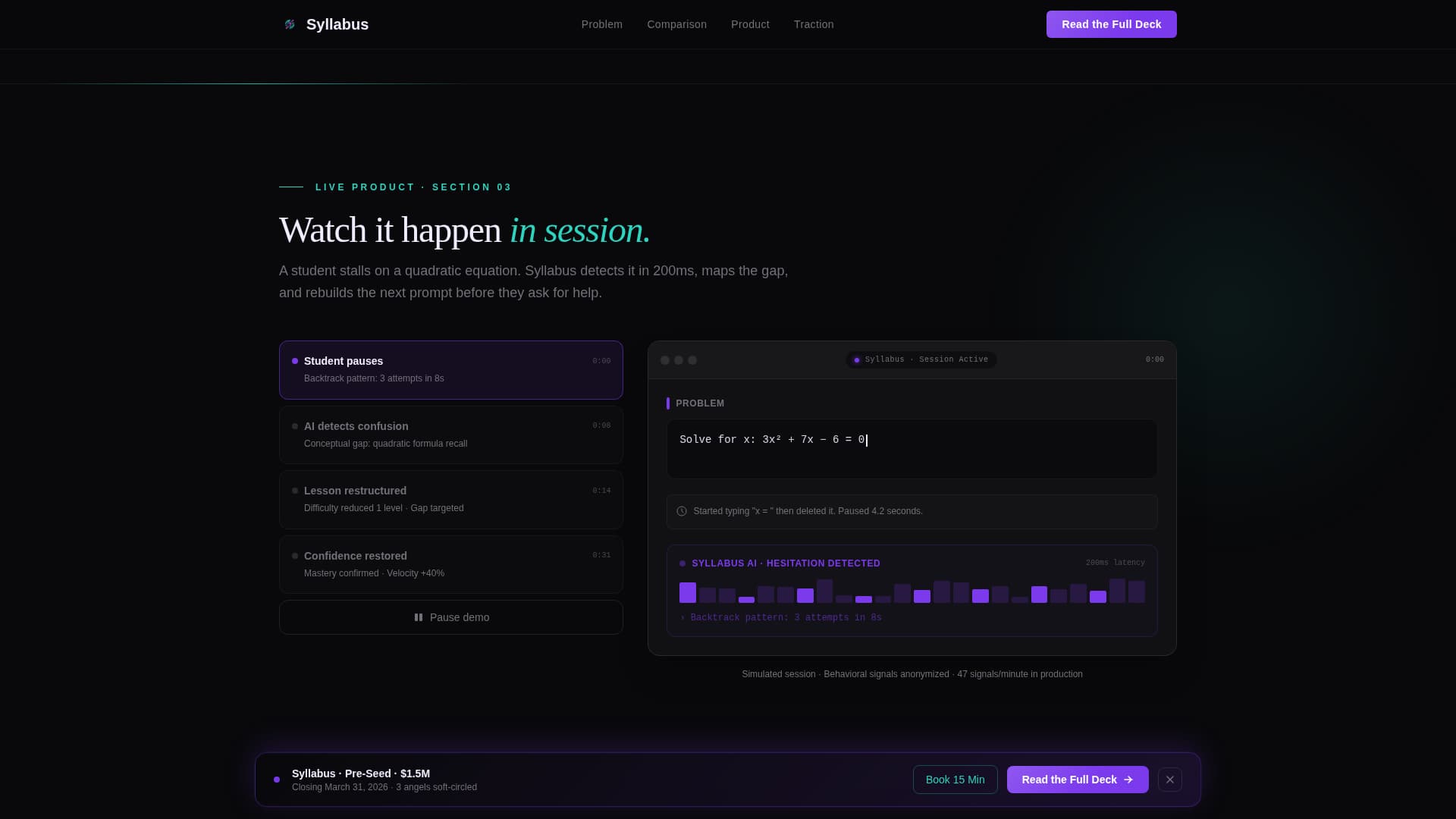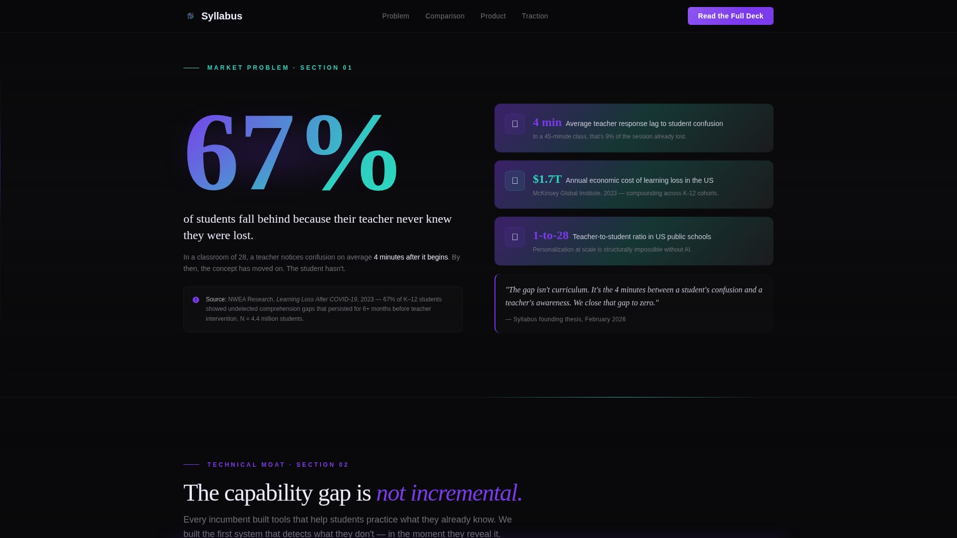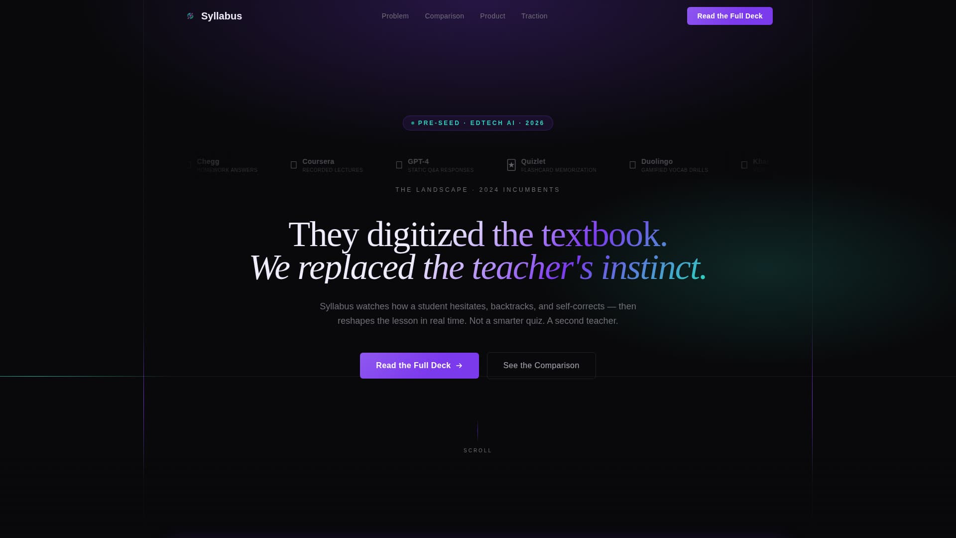 Syllabus is a single-page investor pitch template for an edtech pre-seed startup. It flows like a proprietary research brief: one devastating stat, one comparison table, one animated product moment, and two precisely placed calls to action. The design runs dark and data-dense, using void black, spectral violet, holographic teal, and pearl white to build calm conviction at every scroll depth.