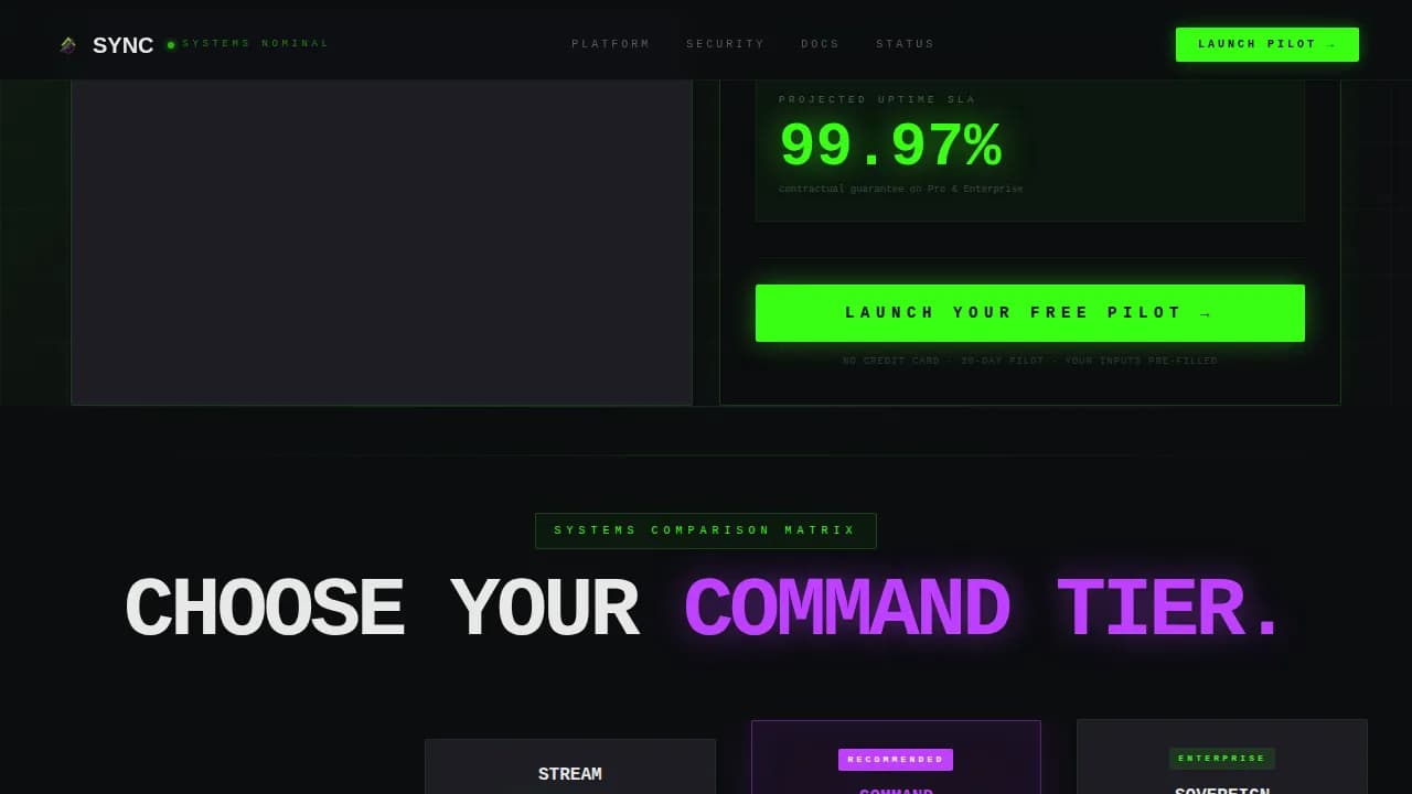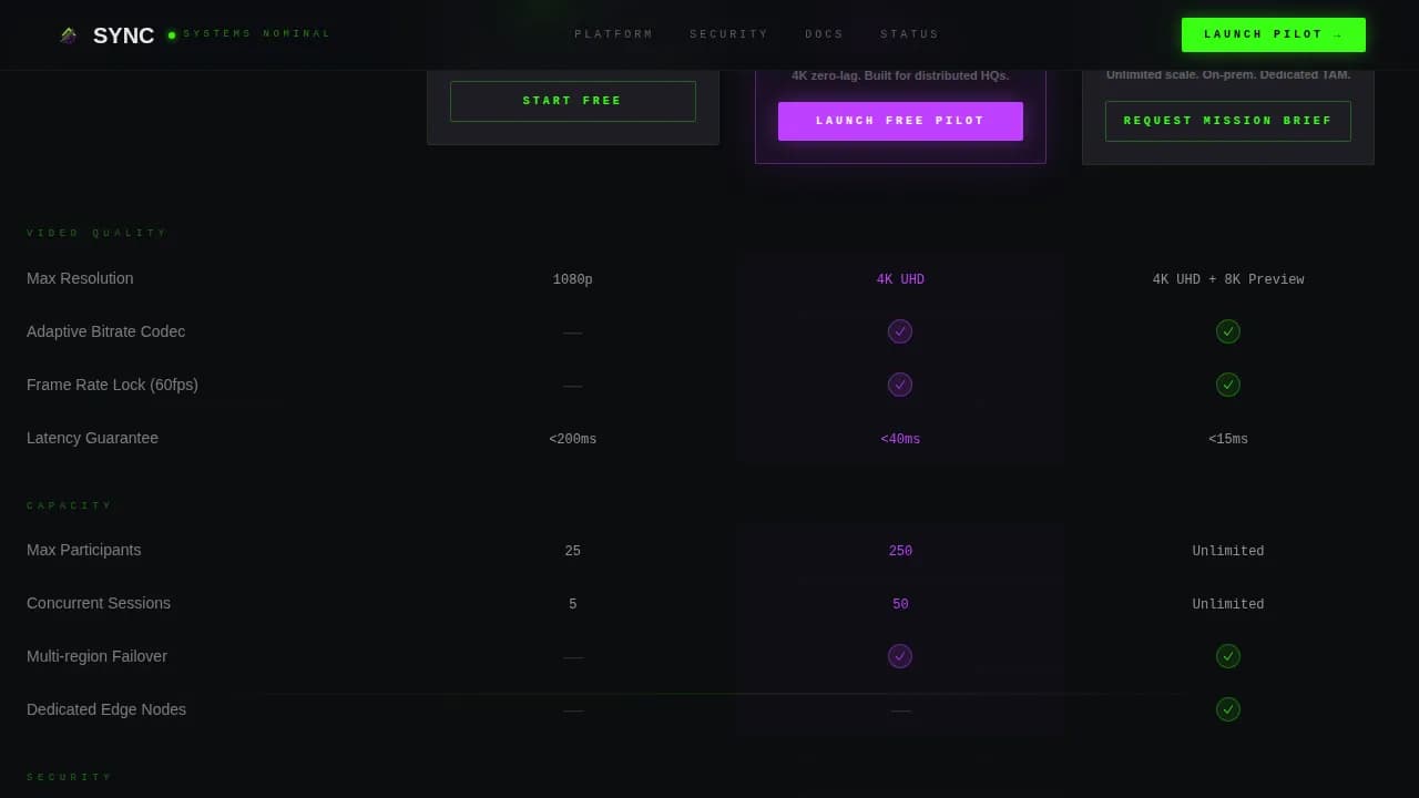 The Sync Data Command Video Conferencing Landing Page Template is a high-energy, mission-control-styled landing page built for enterprise video conferencing services. It leads with an interactive three-slider calculator, flows into an animated comparison table, and locks in a sticky call-to-action bar. The design runs on void black, phosphor green, and ultraviolet to signal precision, speed, and scale.