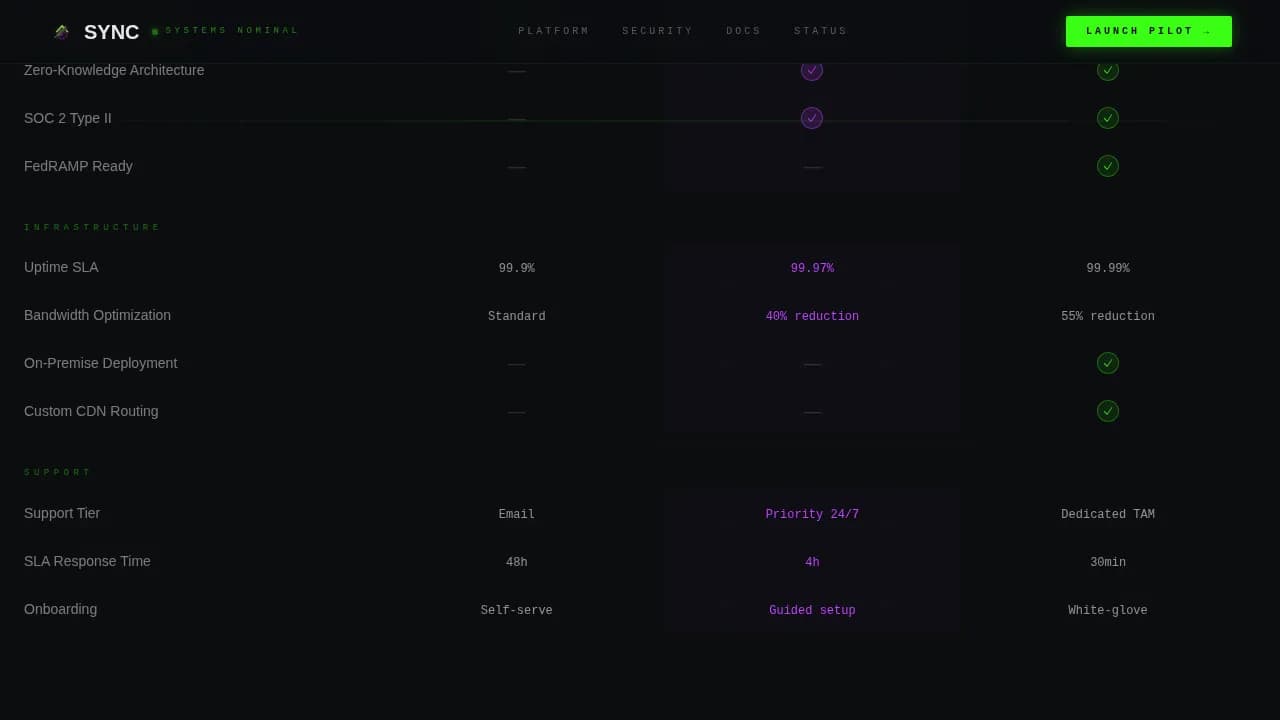 Three pricing tiers are set side by side in a full-width table. Checkmarks animate in rapid staccato, each feature row lighting up like a system coming online. The recommended tier column is marked with an ultraviolet backglow. Competitor columns are shown in muted scanner-line gray. This layout makes tier differentiation clear and compelling for buyers comparing video conferencing options.