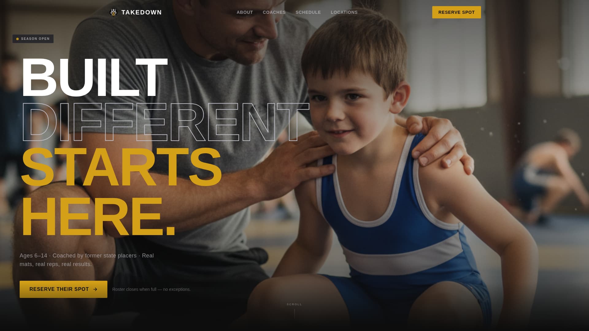 Takedown is a single-page, full-width landing page designed specifically for youth wrestling leagues. It combines a hard-hitting short-form header reel, live social-proof elements, and a persistent call-to-action bar to push families from curiosity to registration. The design system uses forge black, charcoal, chrome silver, and singlet gold to match the raw energy of a wrestling room.