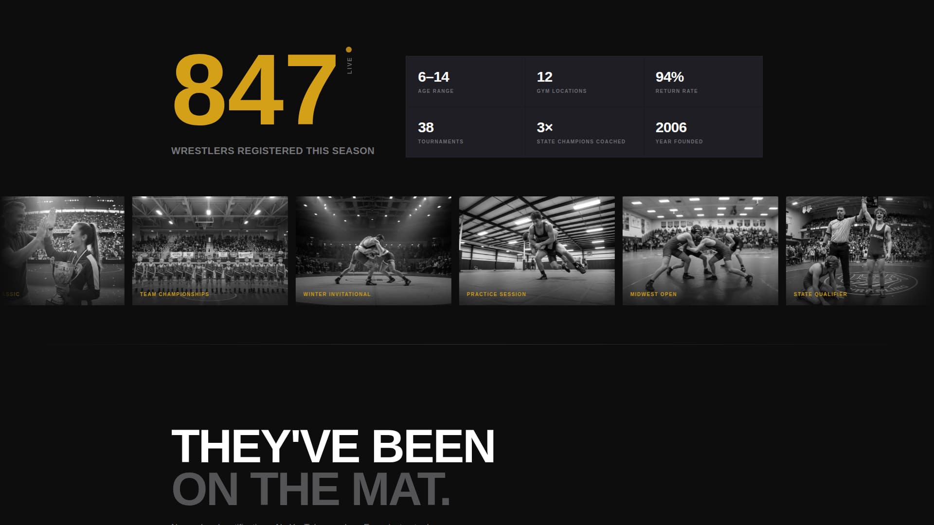 Immediately after the reel, a single oversized statistic displays the current number of registered wrestlers for the season. The counter animates upward in real time, communicating an active and growing roster. This one element manufactures urgency without a single word of hard-sell copy.