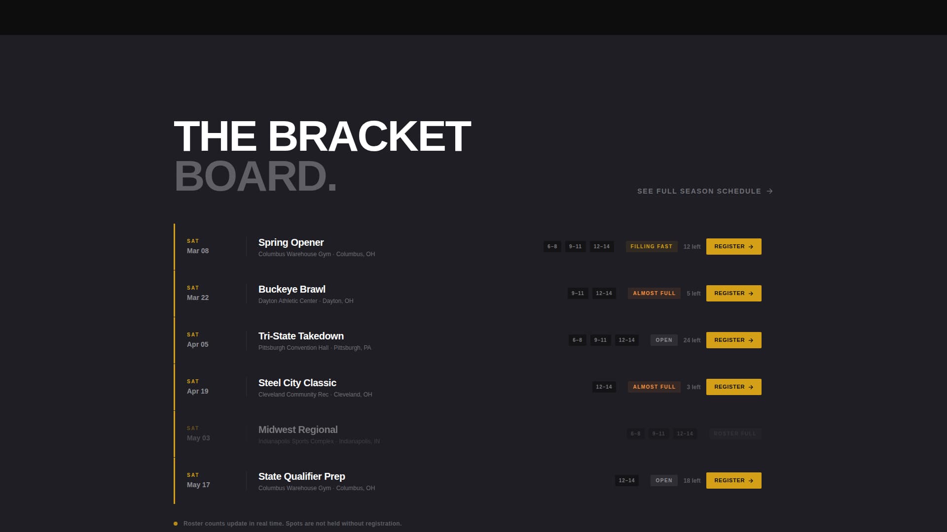 Most sports league pages feel like they were built for a bake sale, not a competition. Families land on a flat page, find no urgency, and leave without signing up. Takedown fixes that directly.