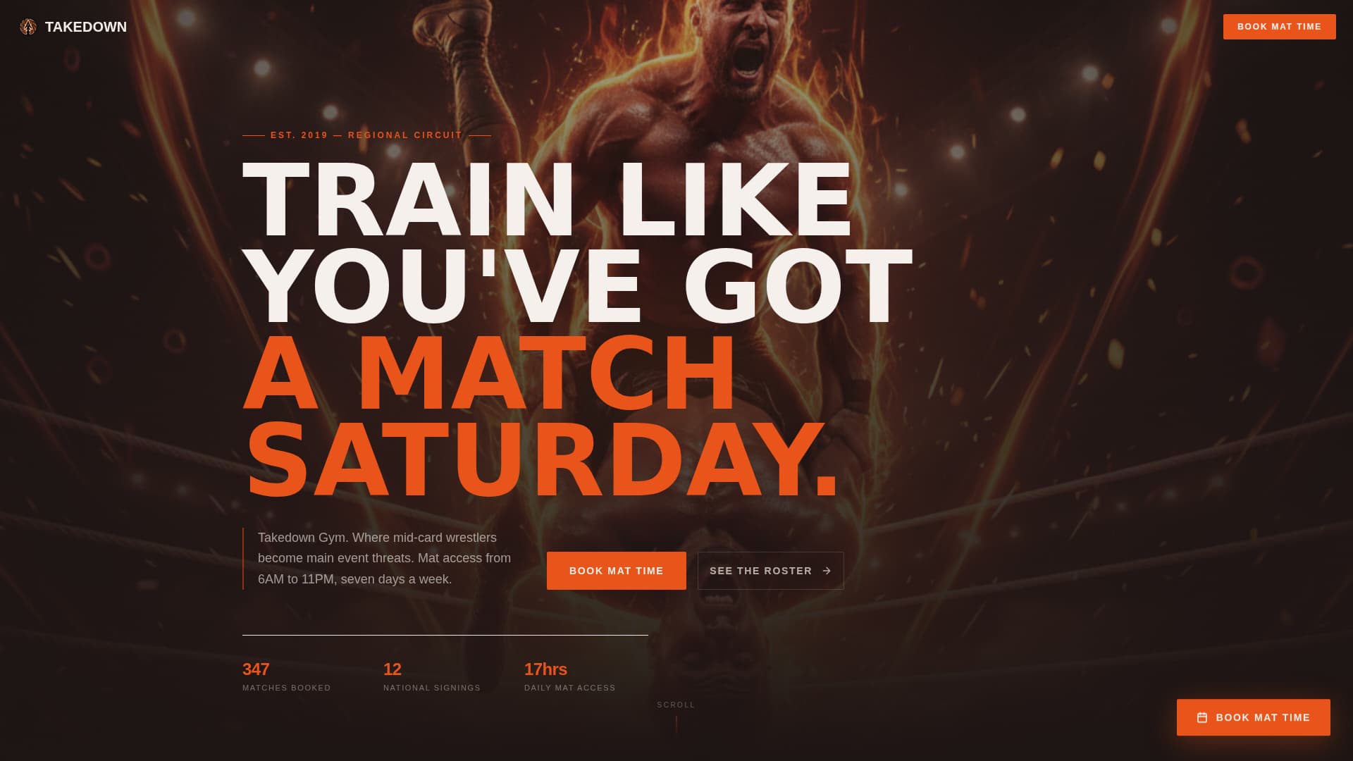 Takedown is a storybook landing page template designed for semi-professional wrestling operations. It leads with dramatic full-bleed visuals, punches through the page with headline statistics, and funnels two distinct audiences into action: wrestlers booking mat time and promoters sourcing talent for upcoming cards.