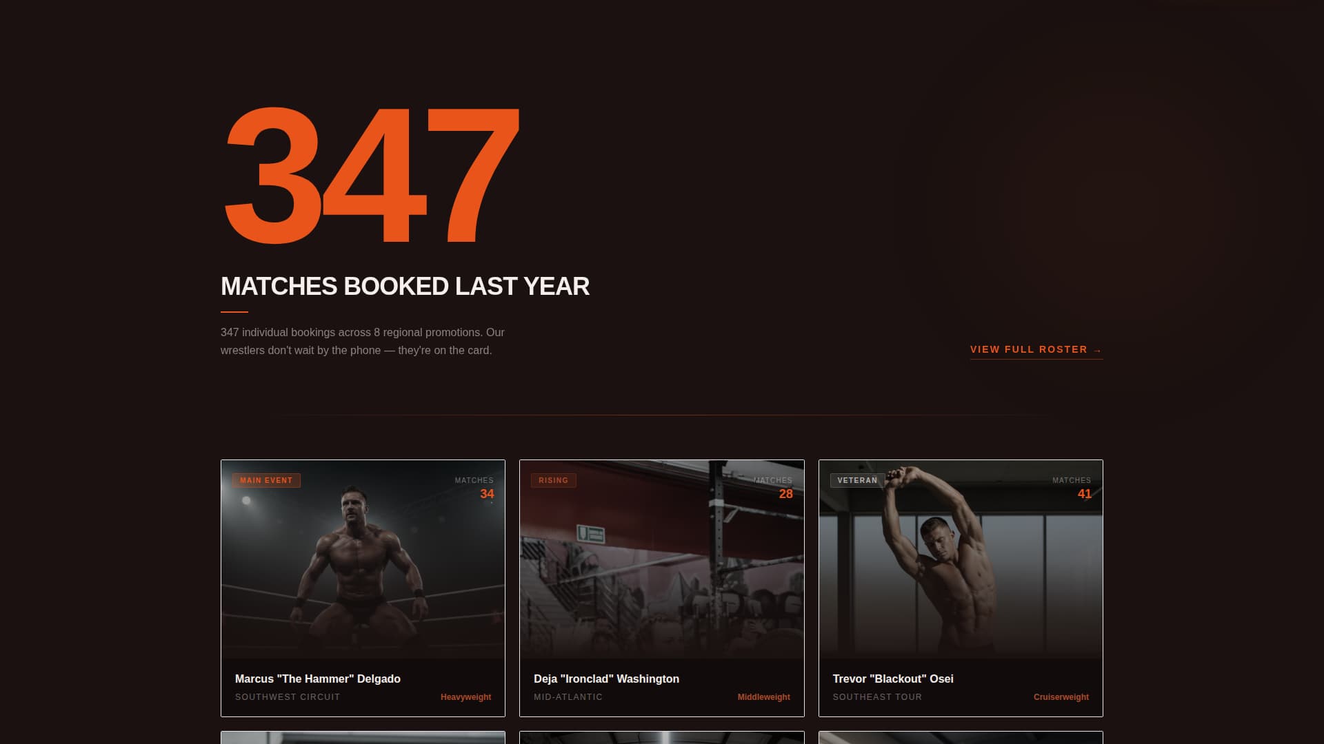 | Roster Gallery | Shows active wrestlers and supports the talent-booking path |
