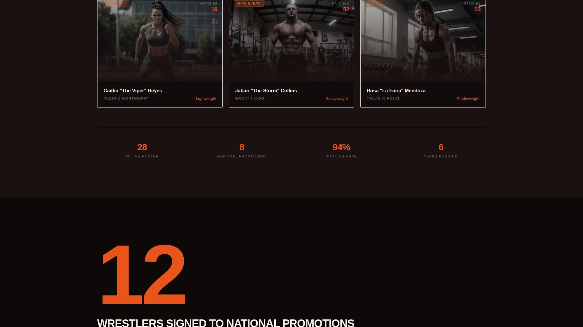 This template speaks directly to the people inside a semi-professional wrestling ecosystem. It handles multiple visitor types without losing focus, keeping every scroll pointed at a clear next step.