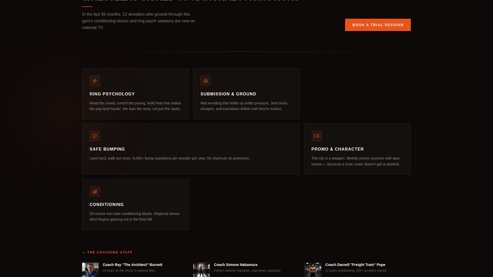 Takedown is a full-page landing page template built for semi-professional wrestling gyms. It combines a cinematic dark aesthetic, stats-driven storytelling, and dual booking flows to convert wrestlers, trainers, and promoters in one scroll. Volcanic black, furnace orange, and scorched clay make every section feel like fight night, not a standard sports website.